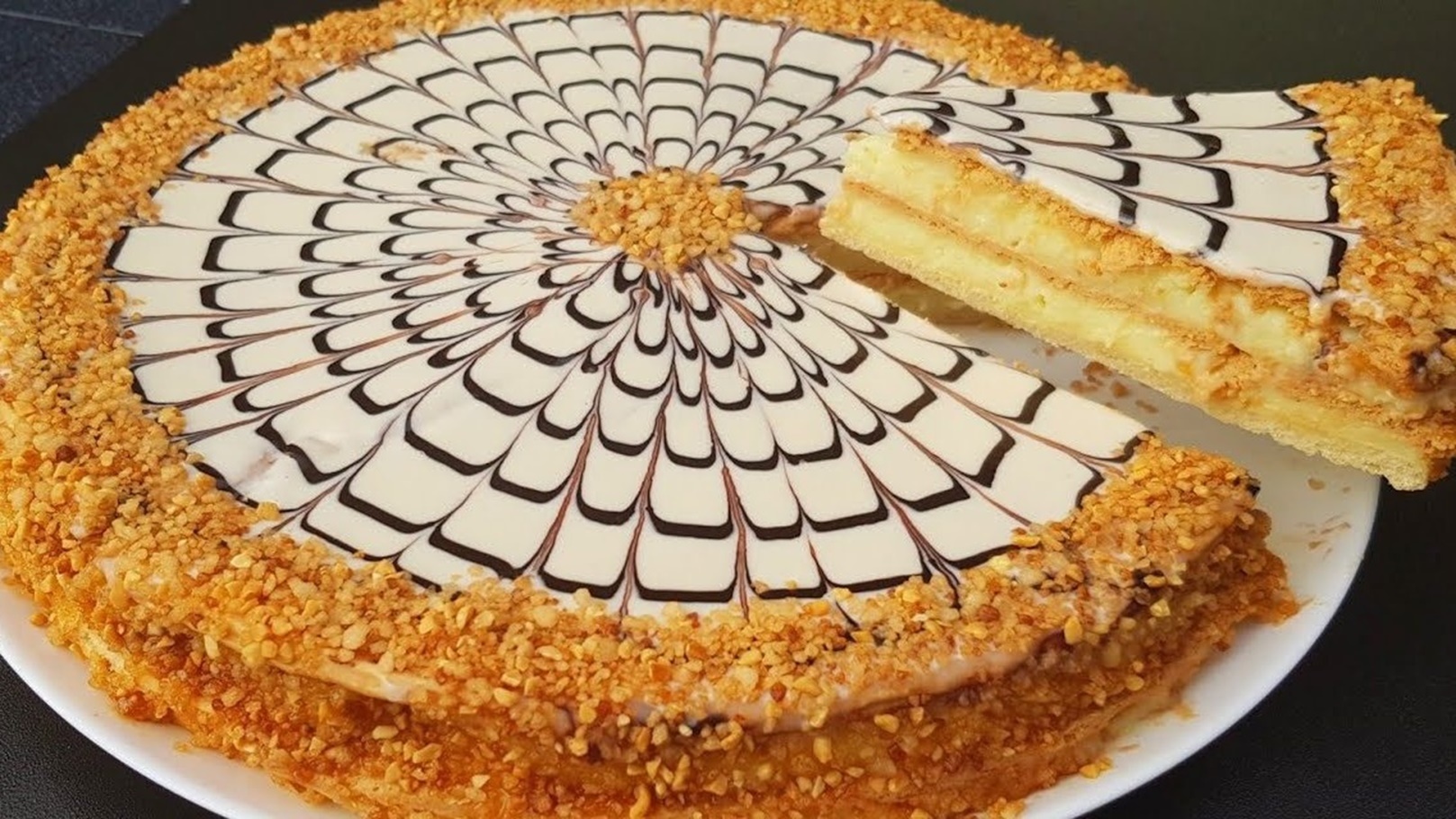 - نقوم بحشو الرقائق بكريمة الباتيسري، ويمكن تزيين قطع الميلفاي بالمربى أو سكر بودرة أو شوكولاتة سائلة أعلى كل قطعة.. وبألف هنا.