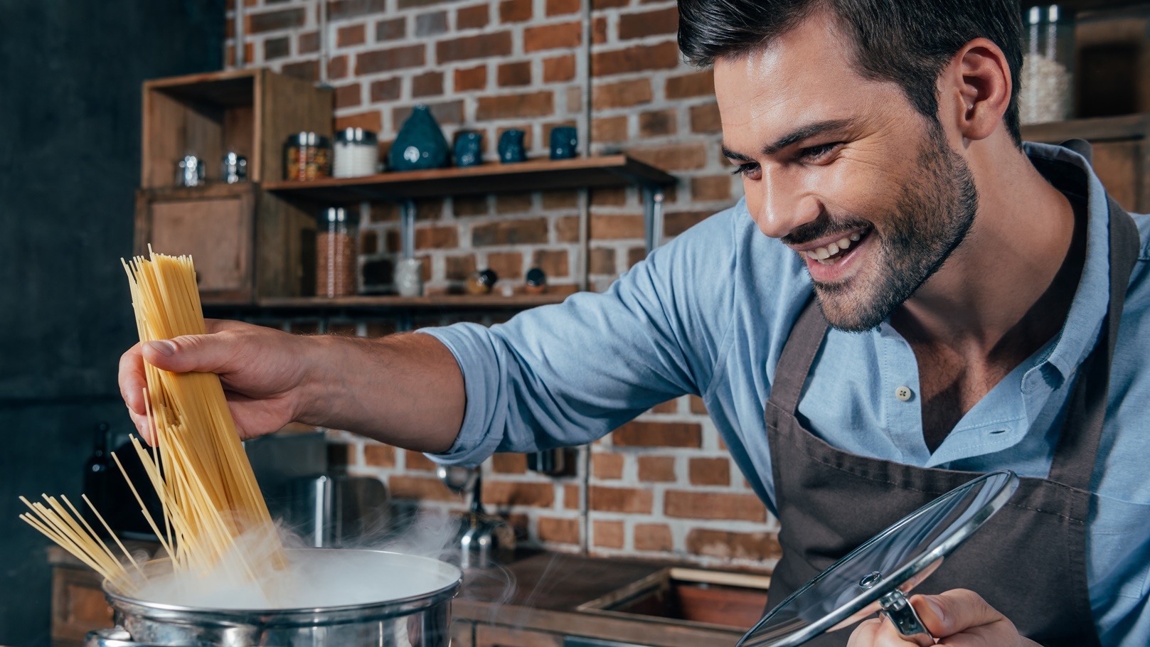 1- نحضر وعاء عميق به ماء مغلي ونضع فيه المكرونة الاسباجتي.
