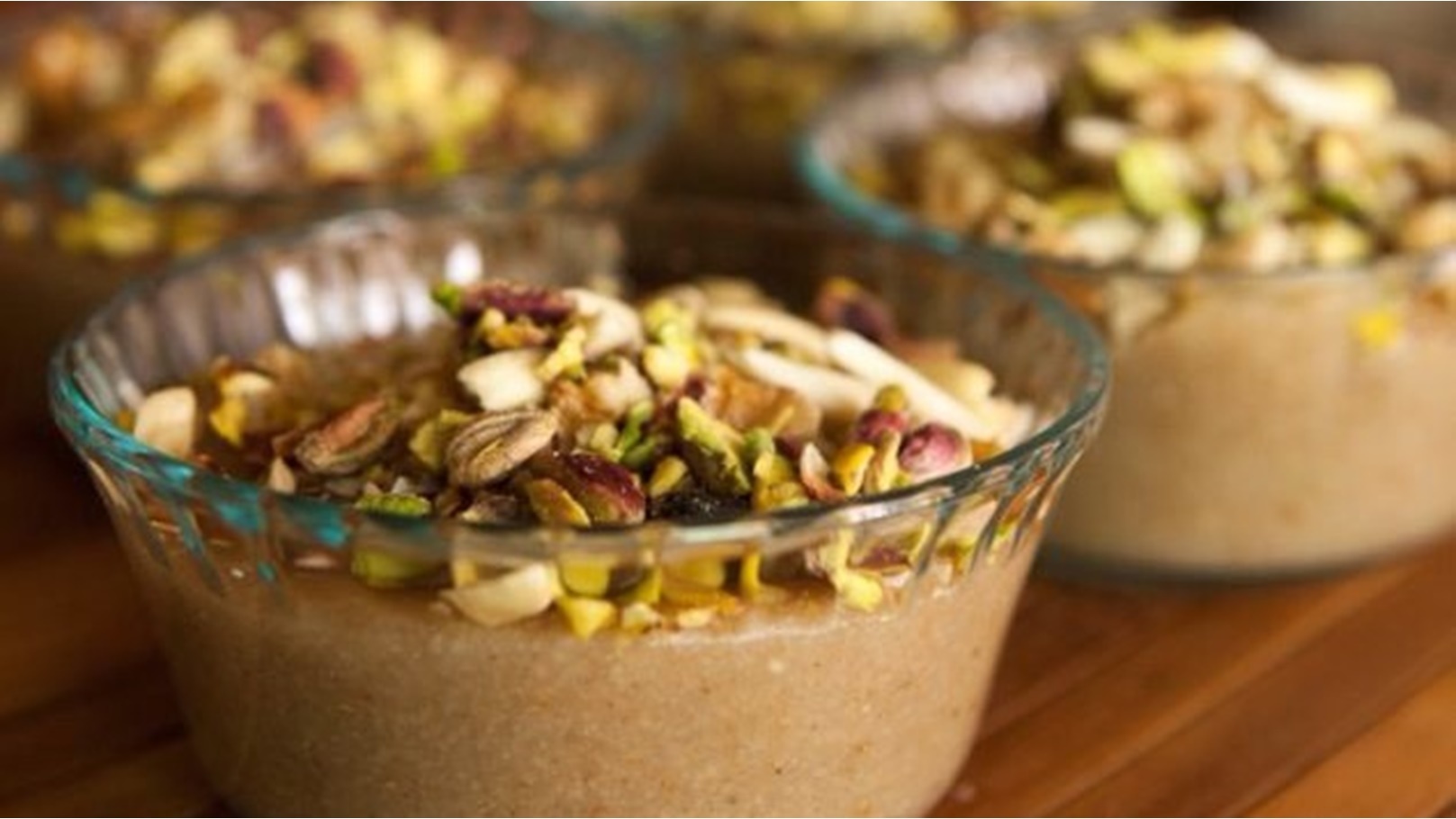 - في طبق التقديم، نضع التلبينة ونزينها بالمكسرات وحبة البركة والعسل.. وبألف هنا.