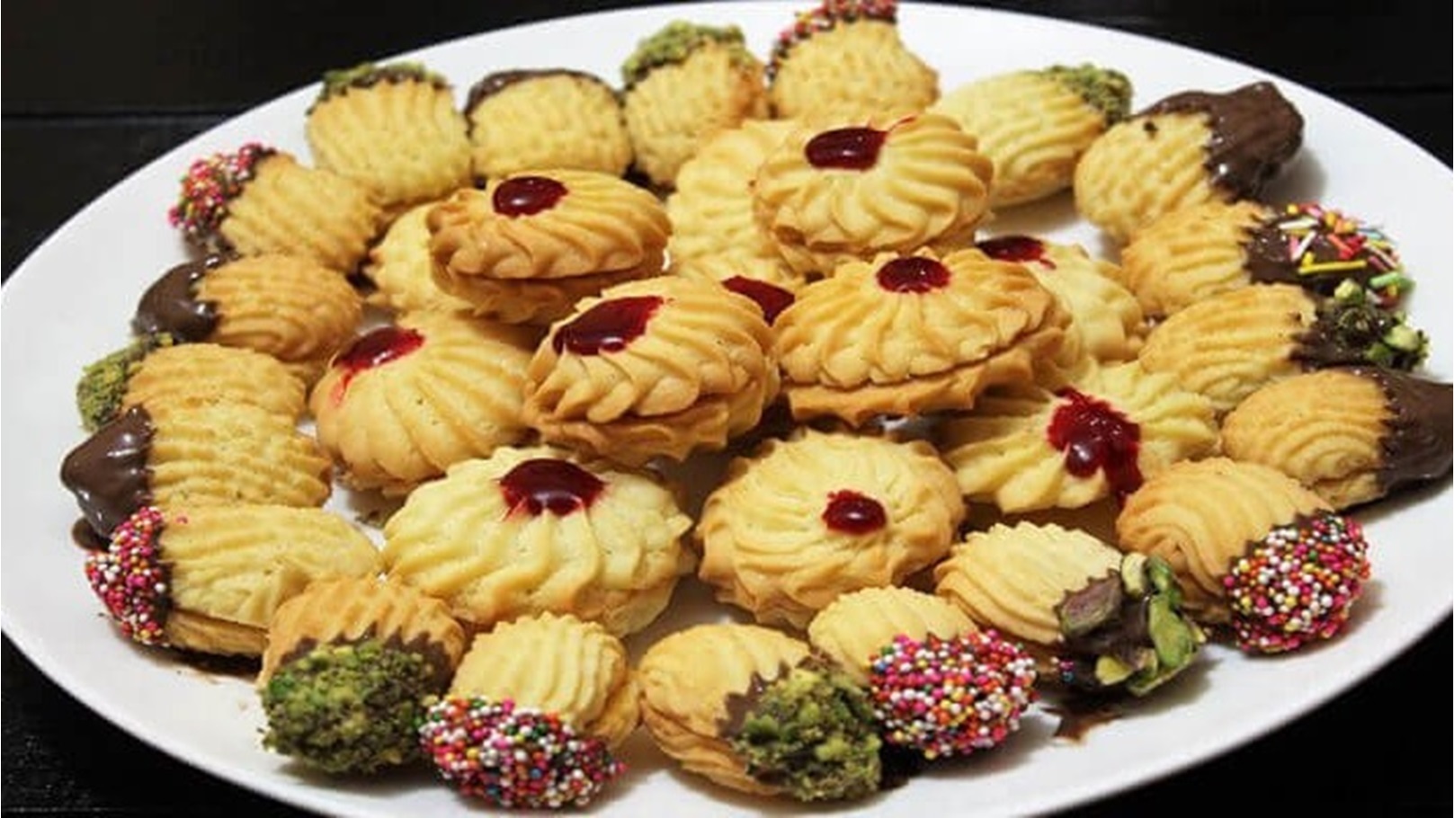 نصف كوب من السكّر الناعم. كوبان من الدقيق. نصف كوب من الزيت أو الزبدة الليّنة. بيضتان. ملعقة صغيرة من الفانيلا. ملعقتان كبيرتان من البيكنج باودر. مربّى للتزيين.