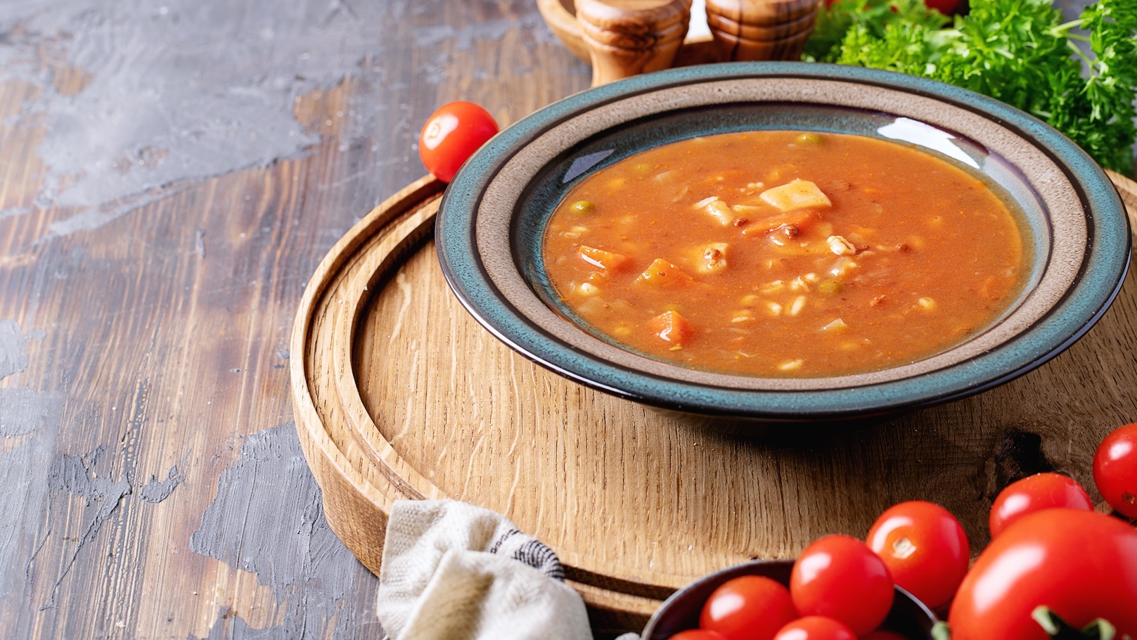 - يوضع في الخلاط كلاً من البصل والطماطم والملح والفلفل ويخفق جيدا ثم يوضع