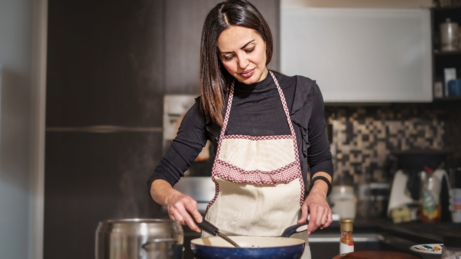 القلي يوضع الزيت ويترك حتى يسخن جيدًا، ثم يوضع فصوص الثوم.
