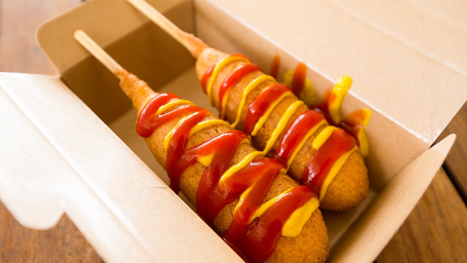 يرش السكر فوق الكورن دوج ويزين بالكاتشب والمستردة.