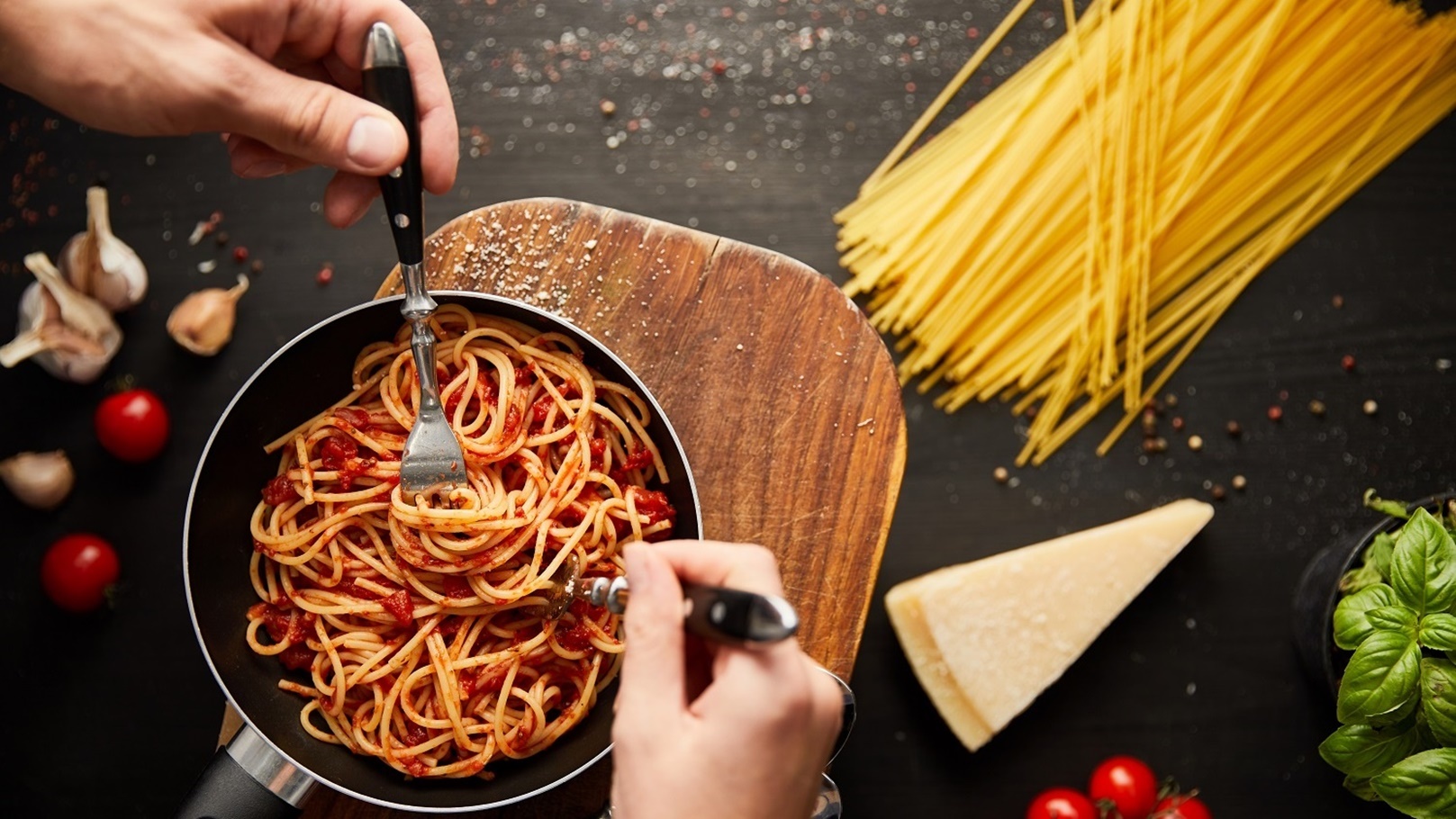 10- نحضر طبق واسع ونضع فيه المكرونة أولًا، ثم نسكب الصلصة على سطح المكرونة الإسباجتي.