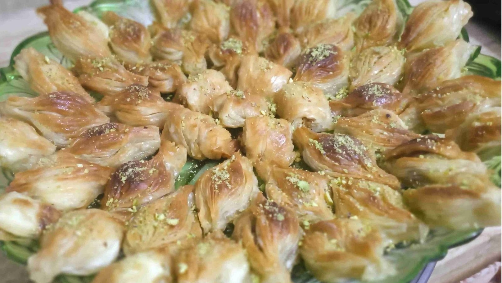 الكسترد علي شكل وردات ويرش بالفستق ثم تغلق الأطراف من الجانبين.
