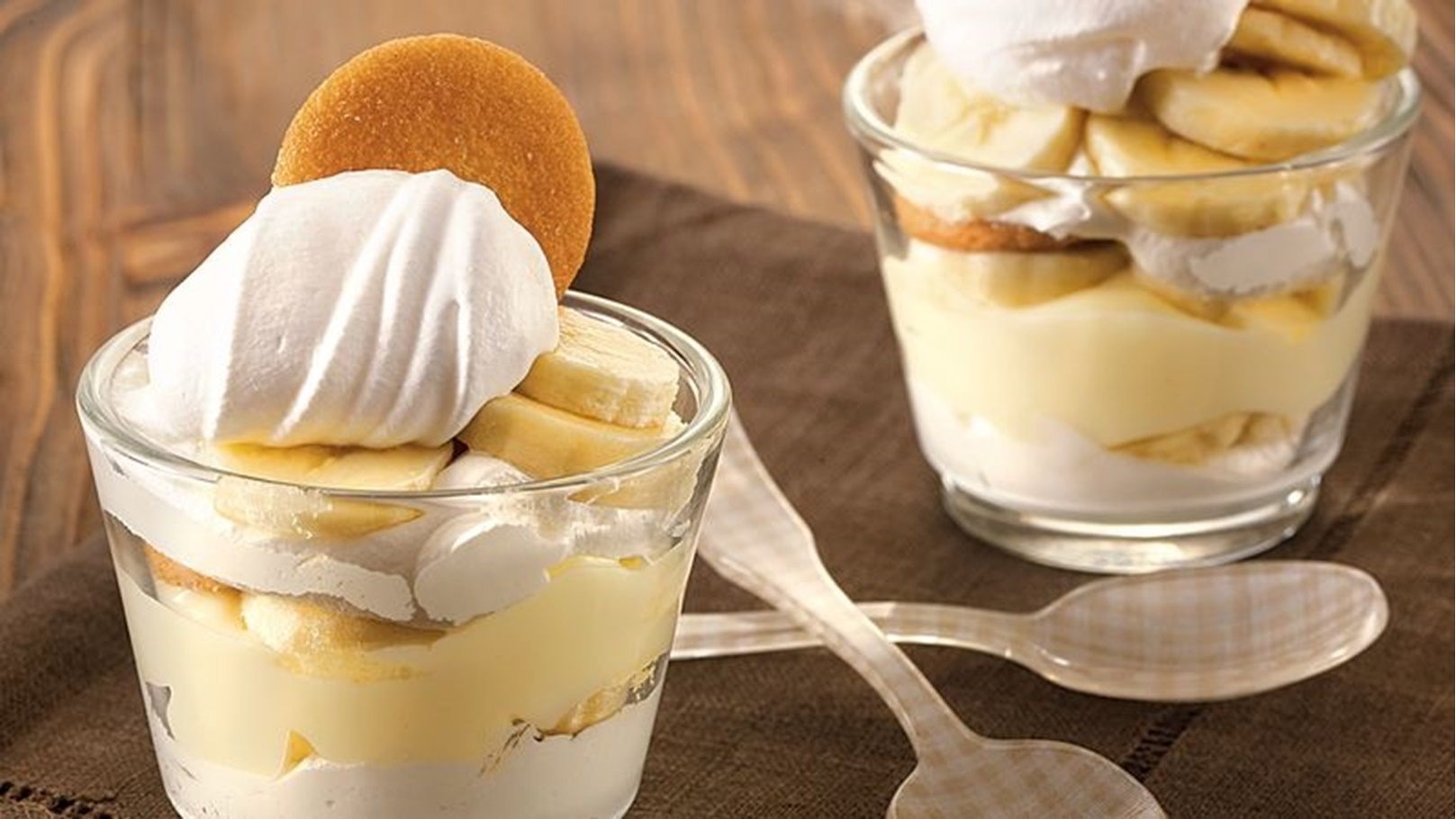 يُقدم بارداً، مع توزيع شرائح الموز والبسكويت على كل طبق، يُمكن استخدام بسكويت دايجستف للتزين.