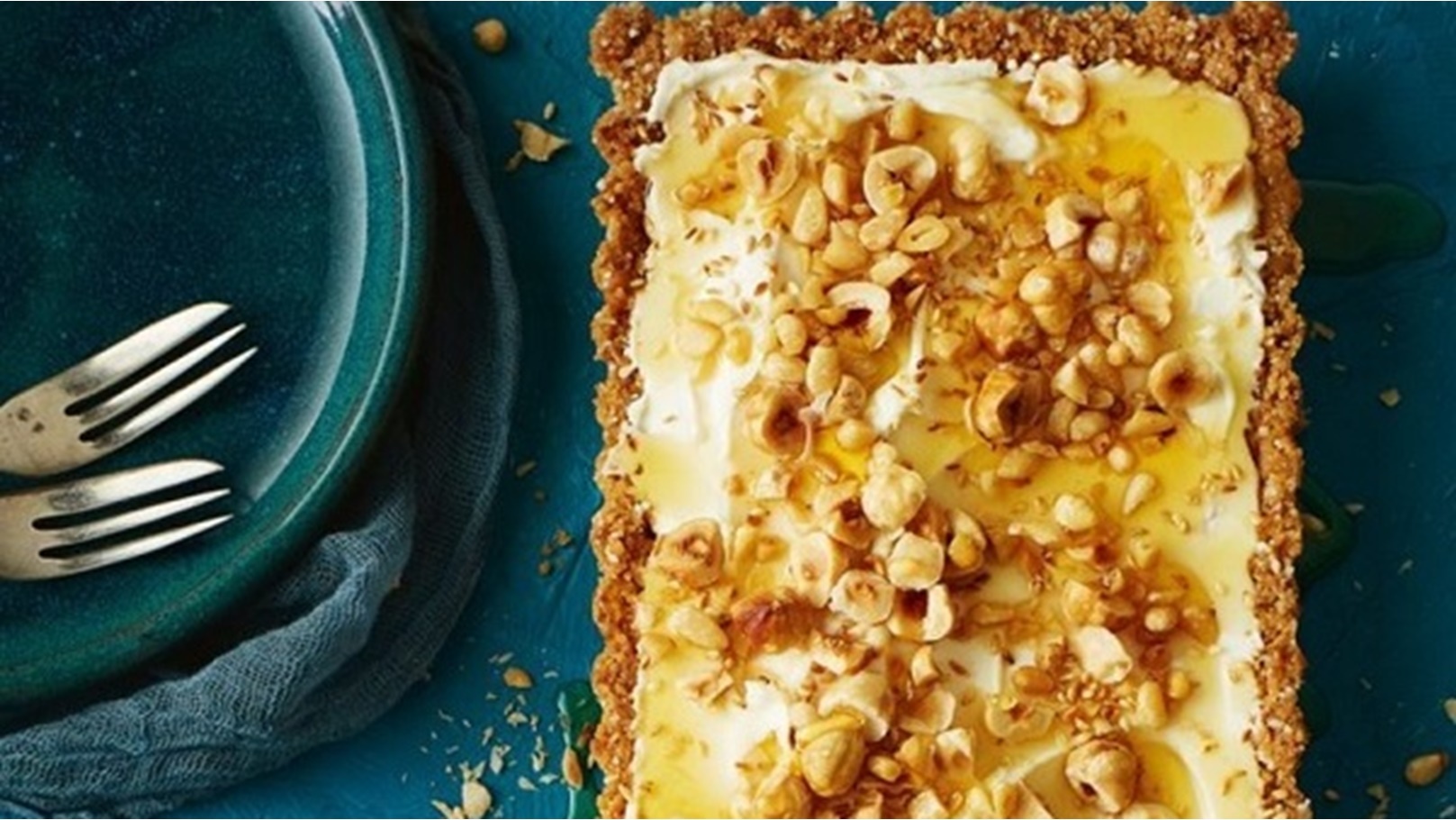 - نضيف خليط البندق والسمسم في صينية التارت فوق طبقة الزبادي، ثم نوزع