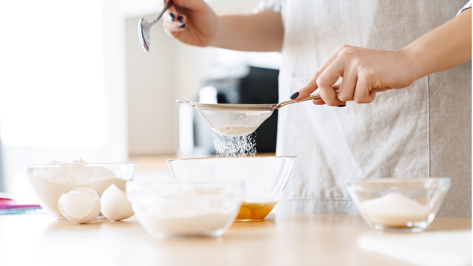 4- نضيف باقي كمية الدقيق المتبقية إلى الخليط، مع استمرار عملية التقليب الجيد.
