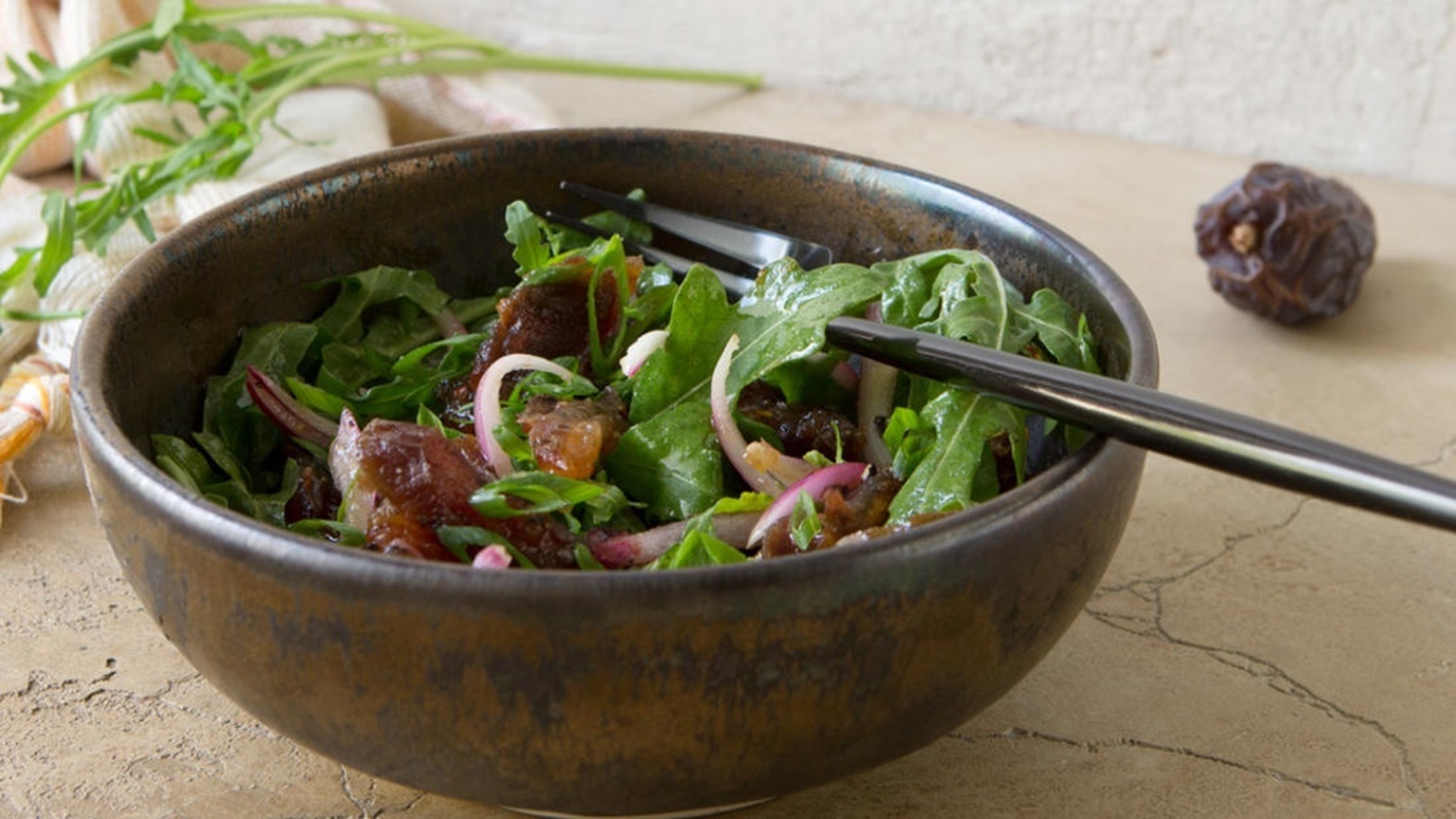 4-في وعاء عميق، نضع كل من الطماطم والجرجير والبصل المفروم مع حبات التمر.