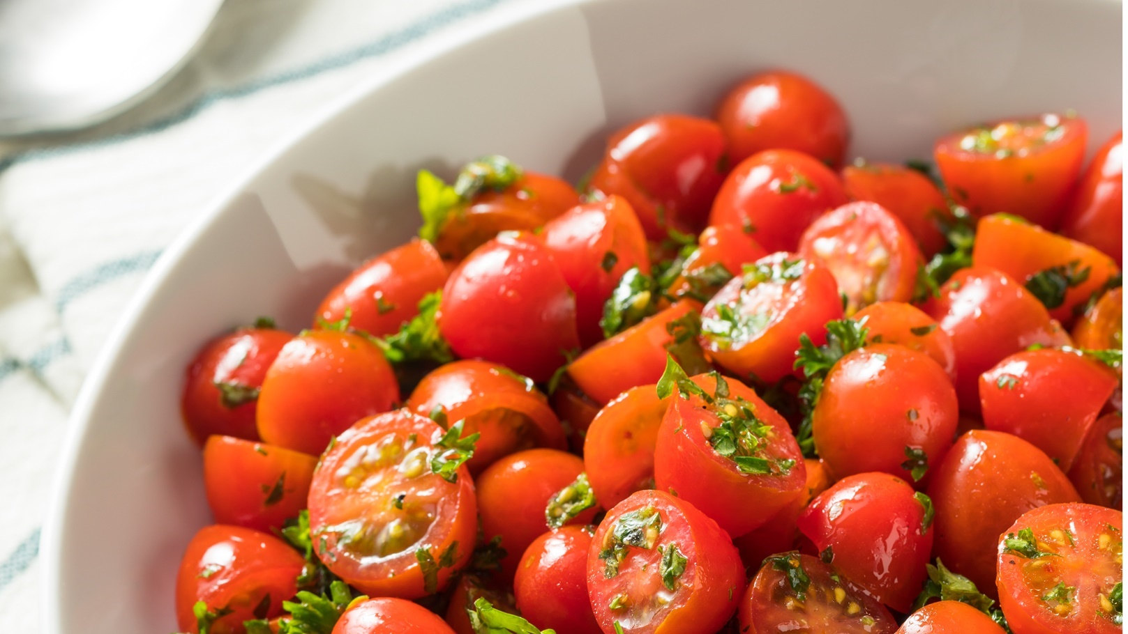 سلطة الطماطم الشيري سلطة لذيذة للطماطم الشيري التي يعشقها الجميع، ينصح بتناولها في شهور الصيف مع كافة الوجبات.