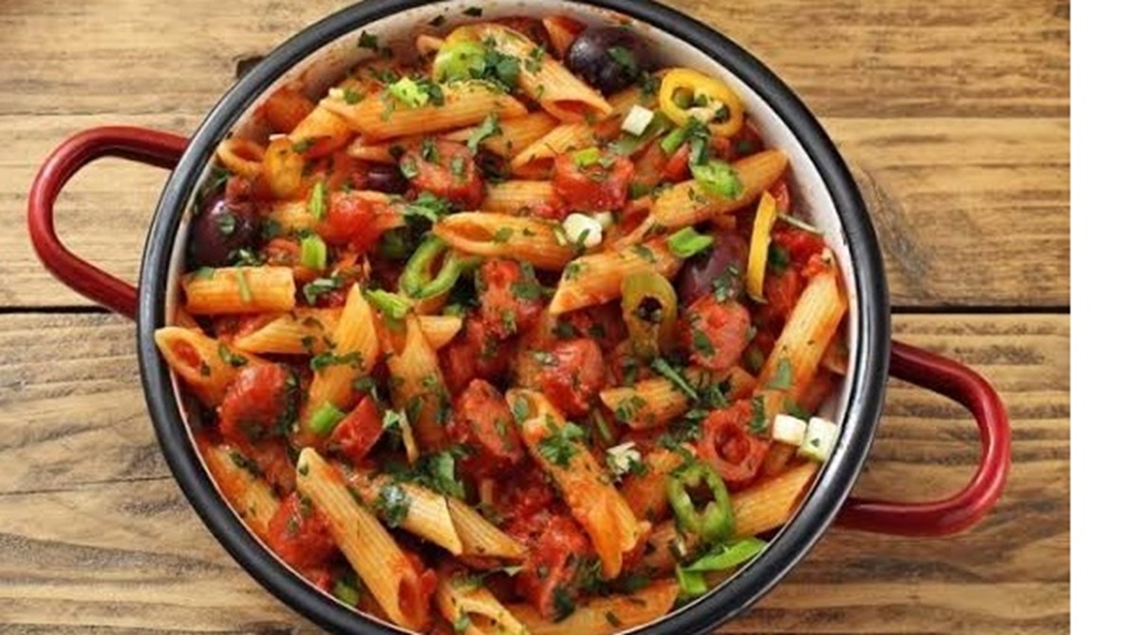 أضيفي المكرونة المسلوقة إلى الصلصة وقلبيها جيدًا حتى تتشرب الصلصة. أضيفي قطع السجق المستوية وقلبي المكونات معًا لمدة دقيقتين. قدمي السلطة في طبق التقديم وزيّنيها بشرائح الفلفل الأخضر والبصل. يمكنك تقديم السلطة ساخنة أو باردة، حسب الرغبة.