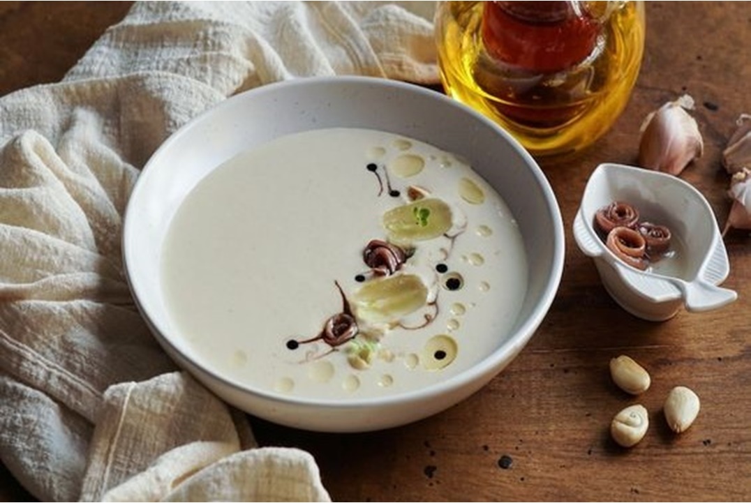 نضع لبن اللوز مع الخبز والثوم والخل والملح في الخلاط، ويضرب جيدًا حتى التجانس مع إضافة الزيت ببطء خلال عملية الخلط (يمكن تقسيم هذه العملية على دفعتين بنصف كمية المقادير لكل دفعة).