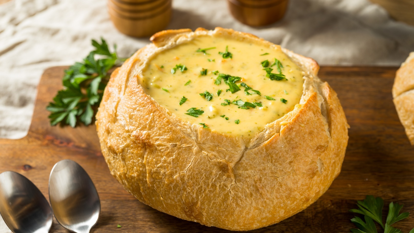 شوربة البروكلي بالشيدر في وعاء الخبز