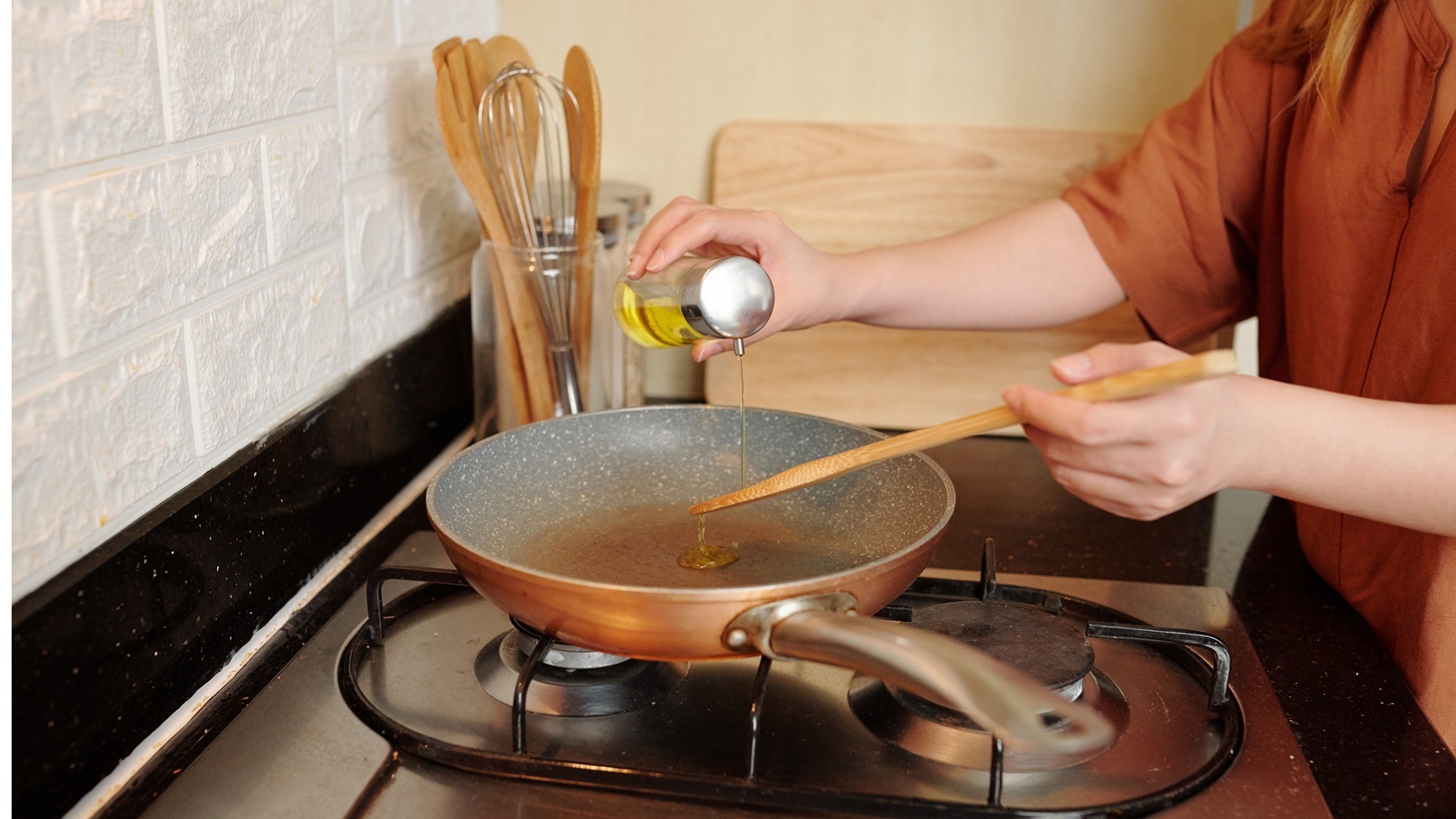 2- نحضر مقلاة واسعة على النار ونحمص فيها المكسرات مع إضافة زيت الزيتون، ثم نرفع تلك المكونات من على النار عندما تاخذ اللون الذهبي، ثم نتركهما جانبًا.