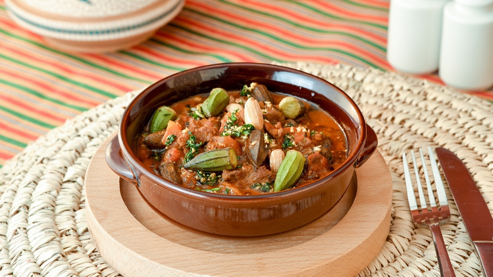يمكن تناول طاجن البامية بالخضار مع العيش السخن الطازج.