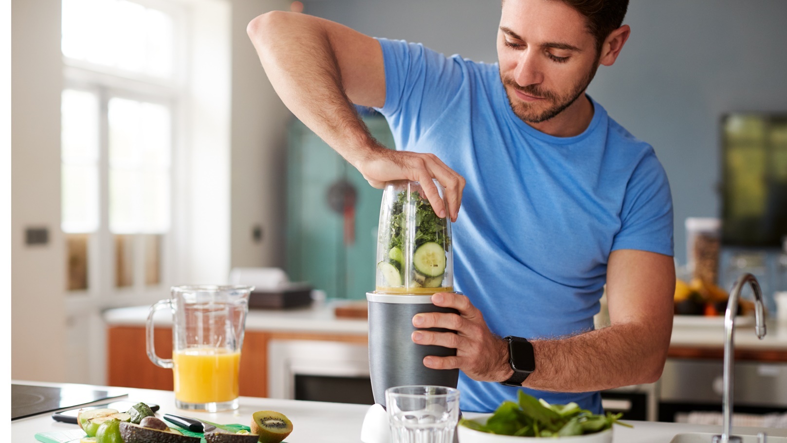 1- نحضر الخلاط الكهربائي ونضع فيه كلا من الكيوي وعصير الليمون، ونخفق تلك المكونات جيداً.