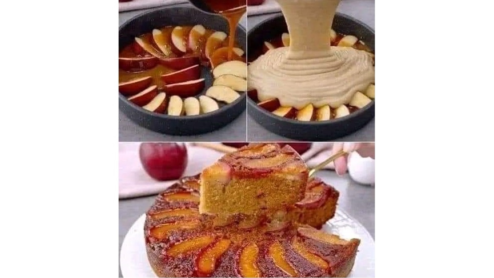 في مقلاة على النار توضع الزبدة والسكر البني ليتحول الى كراميل ذهبي اللون، تُرص شرائح التفاح في قعر قالب الكيك ، و يُصب عليها صوص الكراميل ، ثم يُترك جانباً.