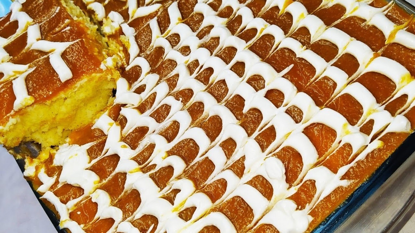 - نخرج الكيك من الفرن بعد انتهاء الموعد المحدد ونثقبها عدة ثقوب بالشوكة، ثم نسقيها بالحليب والسكر.