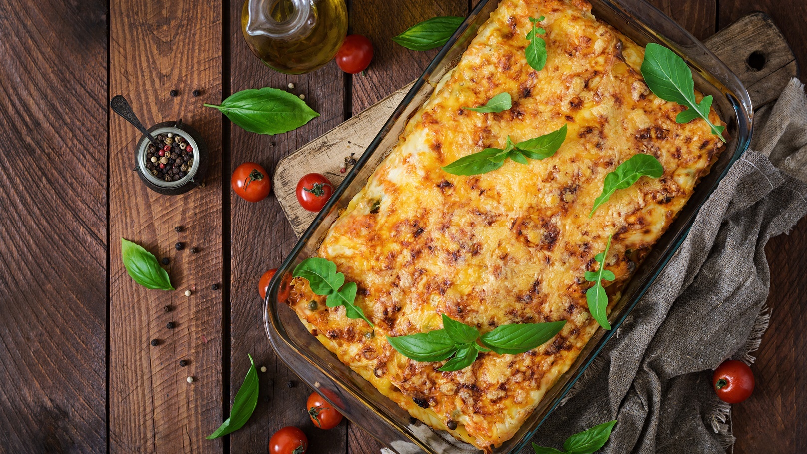 ويُرش الجبن النباتي المبشور ويُخبز حتى تصبح اللازانيا ساخنة جدًا ويذوب الجبن