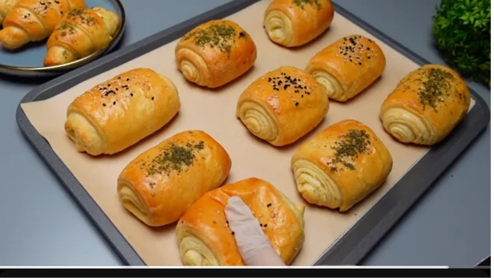 - وبعد خروجها نقوم بفردها مرة أخرى ونفردها على شكل مستطيل ومن المنتصف نقسم العجينة نصفين ونقسم كل نصف لقطع بالطول، ونقوم بلفه رول.