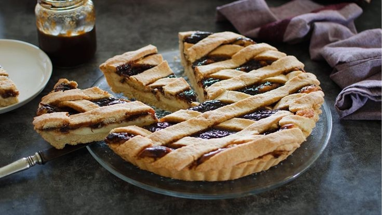 - نقطع العجينة إلى شرائط رفيعة ونرتبها على سطح المربى بشكل متقاطع لتشكيل شبكة.