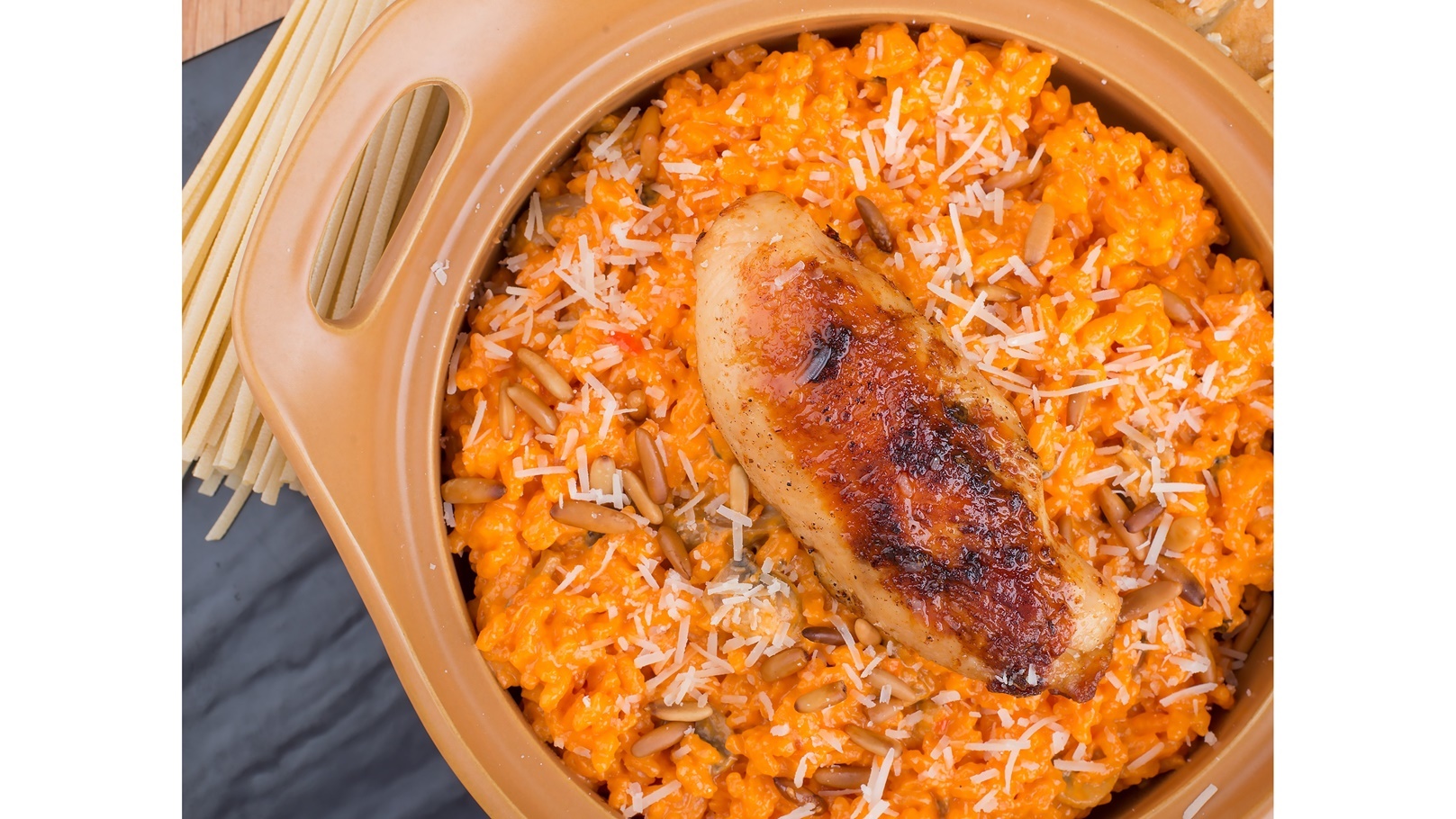 - بعد أن ينضج الأرز نسكبه في صحن التقديم، ونضع عليه الدجاج المحمر