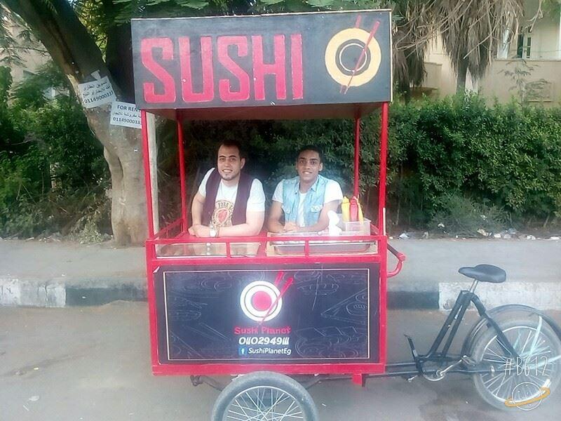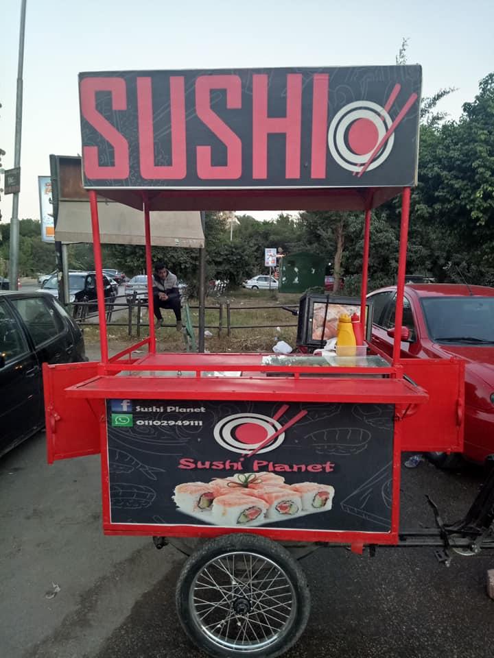 على بعد خطوات قليلة، من محطة مترو المعادي وتحديدًا في شارع 9، يقف شابان في مقتبل العمر بعربة طعام "شيك"، يبيعون أطباق السوشي للمارة بالشارع، وبمجرد عبورك نحو الشارع، تجذبك رائحة الطعام التي تنبعث من عربة "سوشي بلانيت"، لتفتح شهيتك على الاقتراب أكثر منها.