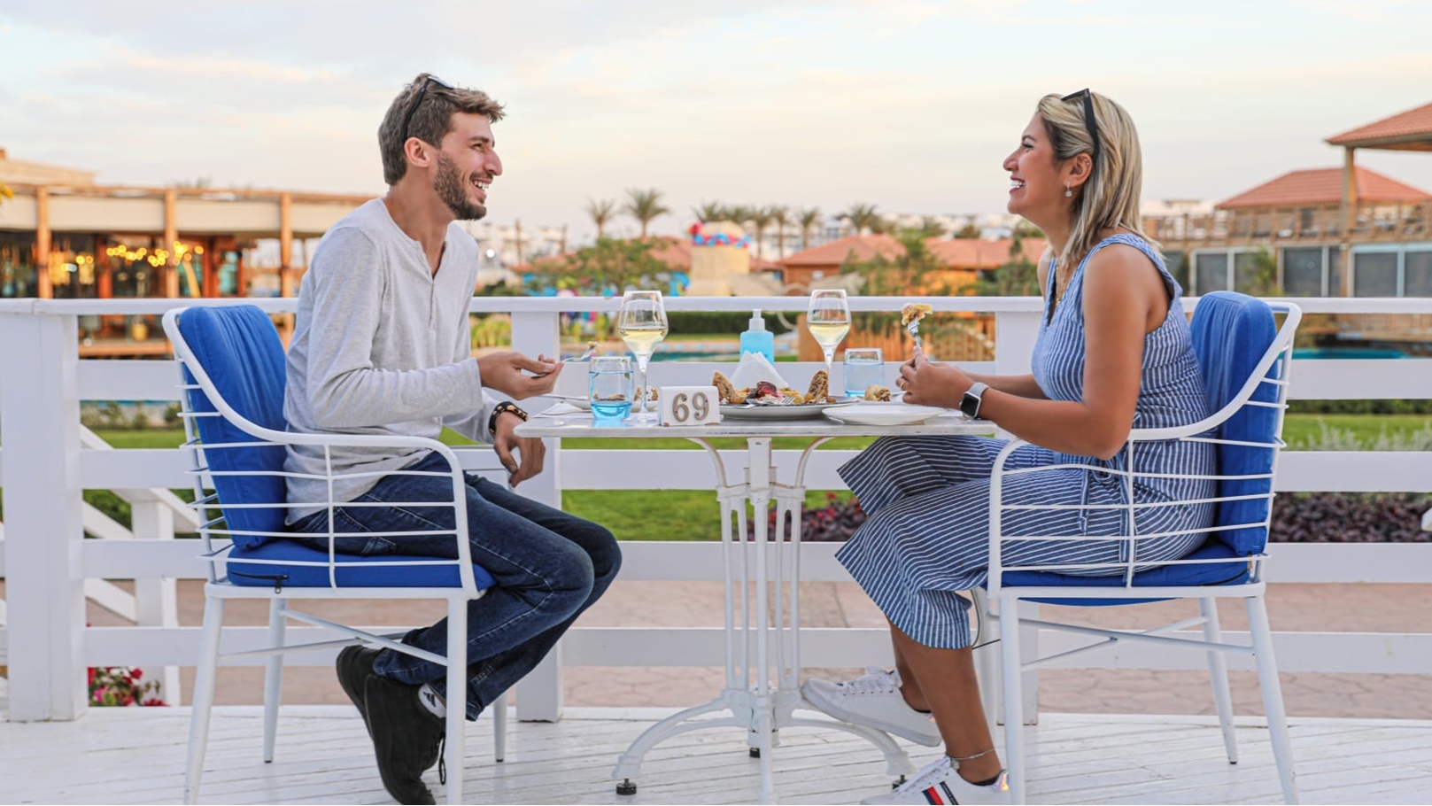 البيضاء والزرقاء، والفيو المُطل على البحر، لتستمتع بوقتك مع أصدقاء بتناول أطباق