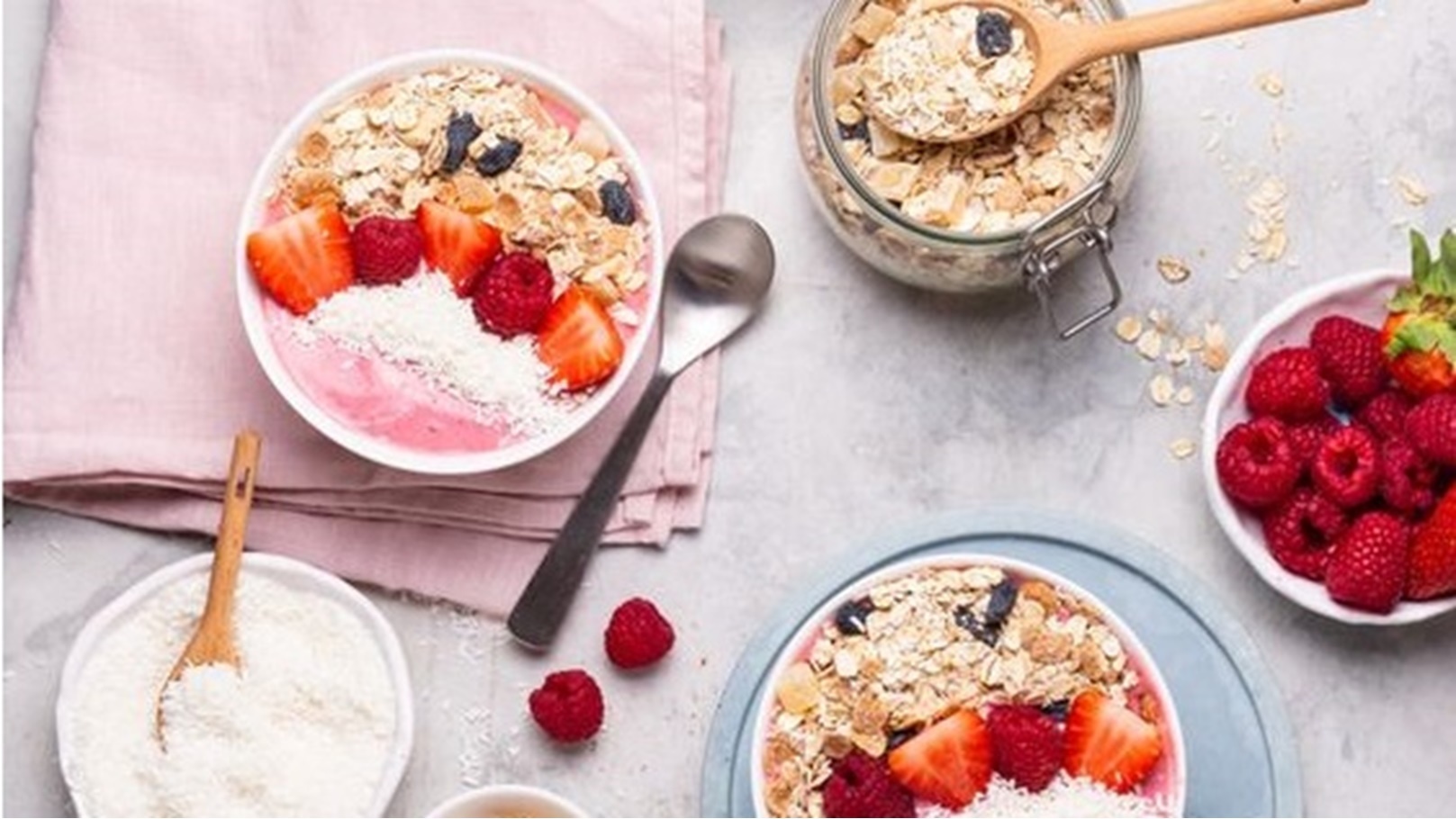 يتم خلط المكونات في الخلاط الكهربائي ويضاف فوقها شرائح الكيوي والموز والفراولة وبعض بذور الكتان وجوز الهند المجفف.