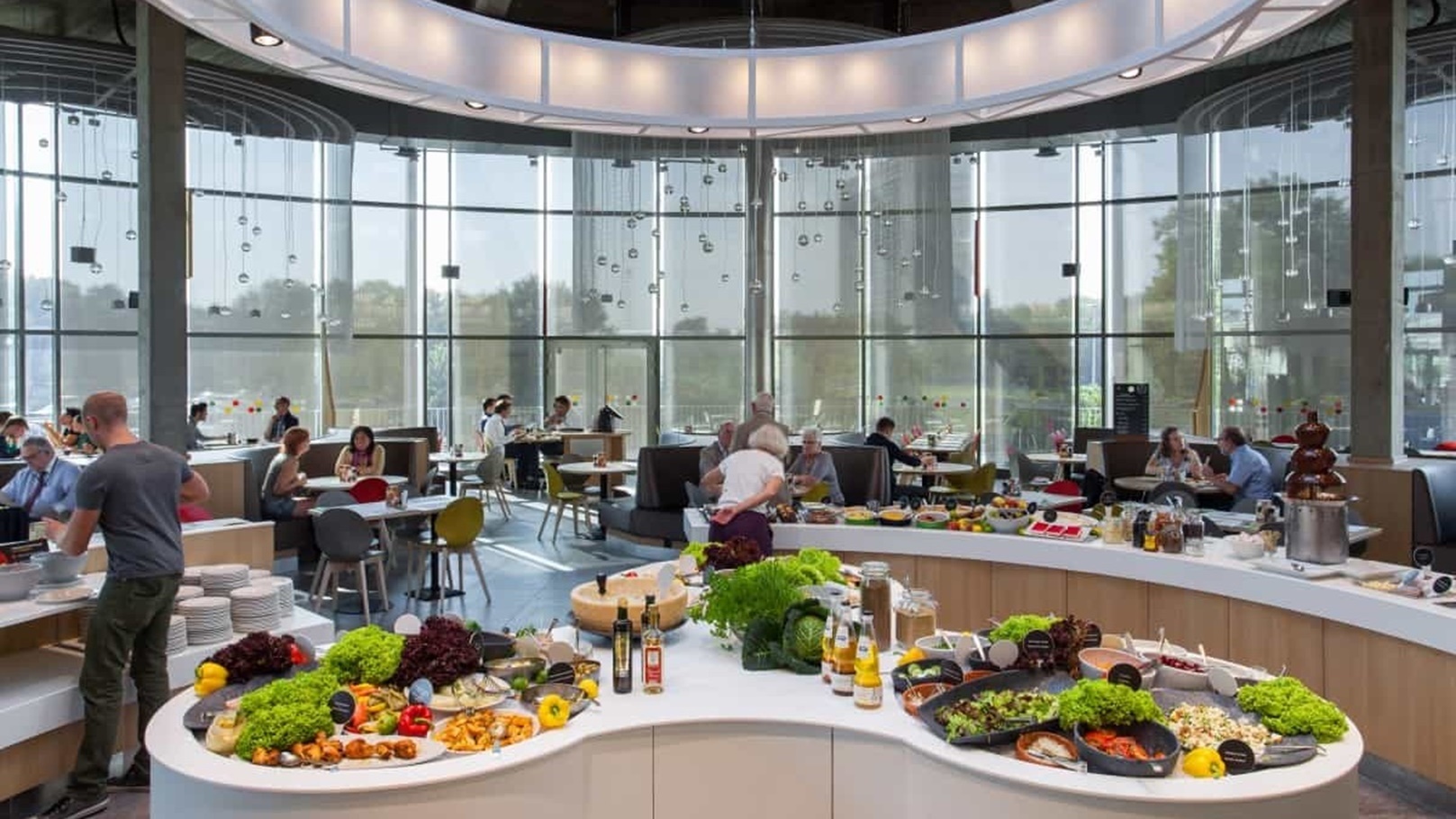 وكل صالة بها 100 مقعد يرحب بك المطعم فور جلوسك من خلال تقديم خبز محلي الصنع مع بعض قطع الزبدة الفرنسية وصلصة الثوم ثم تبدأ رحلتك المحيرة لاختيار وجبتك من بين عدة اختيارات مثيرة للاهتمام استمتع بوجبة غداء او عشاء لذيذة بالإضافة الى أجمل اطلالة يمكن ان تحصل عليها اثناء تناولك الطعام