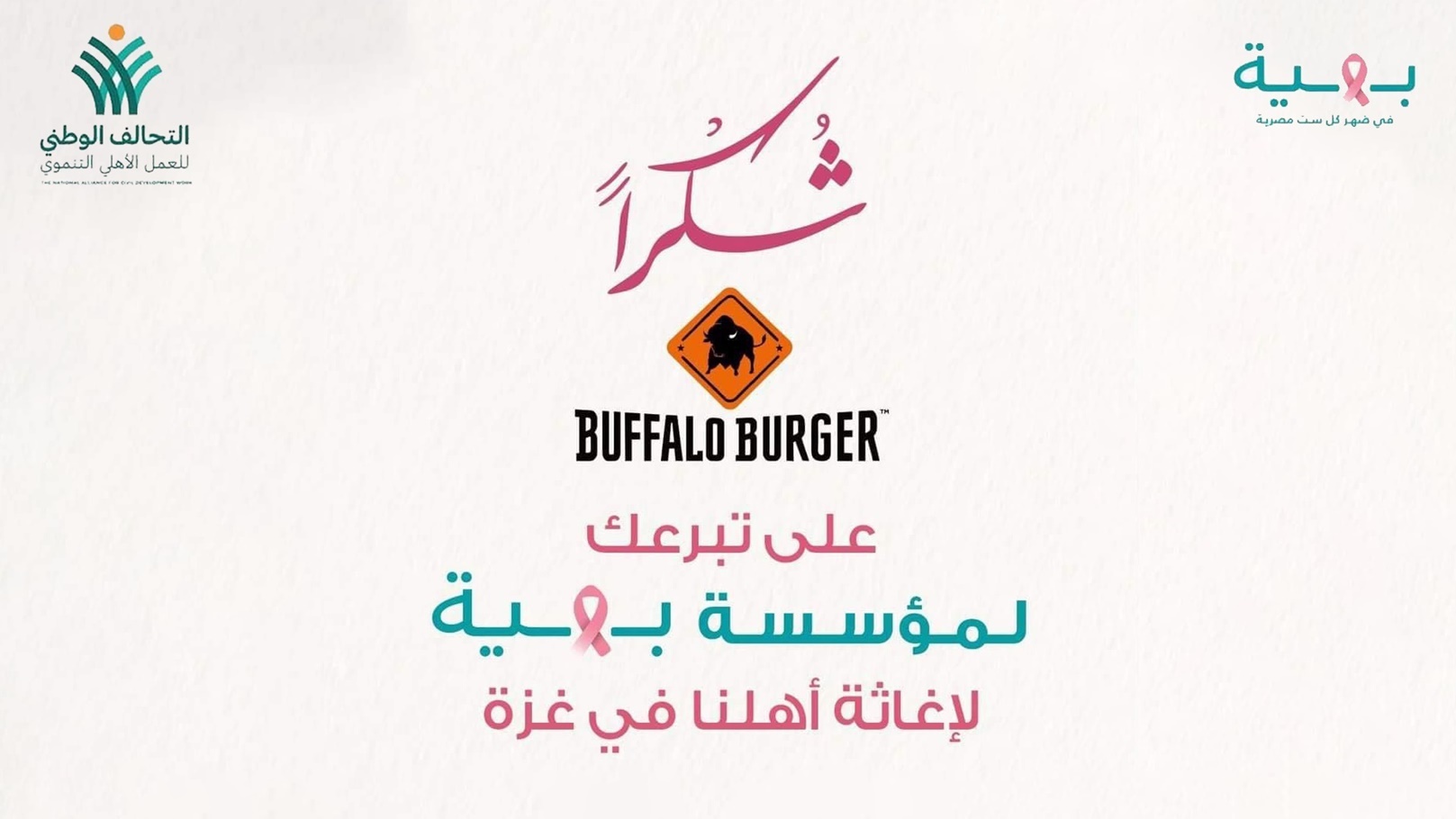 أعلن "بافلو برجر" عبر صفحته الرسمية على "الفيس بوك" عن مشاركته في تقديم الدعم لأهالي فلسطين في قطاع غزة من خلال التبرع لمؤسسة "بهية لعلاج سرطان الثدي" والتحالف الوطني للعمل الأهلي التنموي، من أجل المساعدة قدر الإمكان وتقديم العون لأشقائنا في الظروف الراهنة الذين يمرون بها.