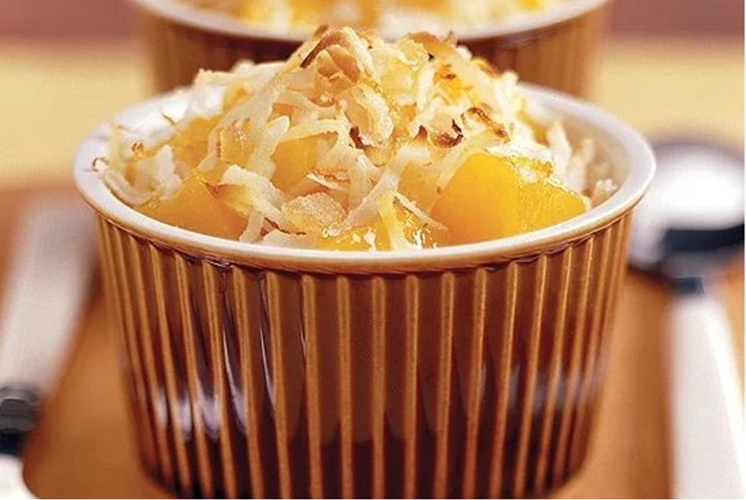 توضع الصينية في الفرن على درجة حرارة 218 مئوية لمدة 10 دقائق أو حتى تسخن المانجو وتتحول الإضافات للون البني.