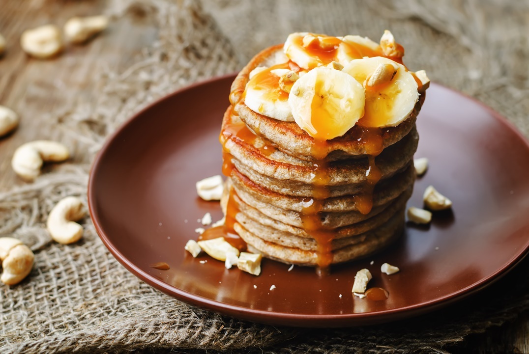 يزين الـpancakes بشرائح الموز وقطع العين جمل المجروش والعسل