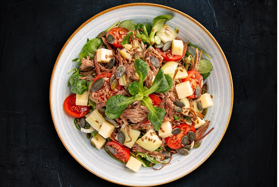 السلطة، ويُوضع الجبن المبشور فوقها.