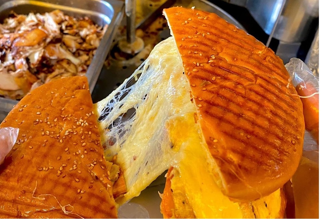 شاورما مع عيش كايزر كبير مقاس العيش الصيامي وموتزريلا وصوص بوصفة مخصوصة من إنتاج المطعم ومقاس