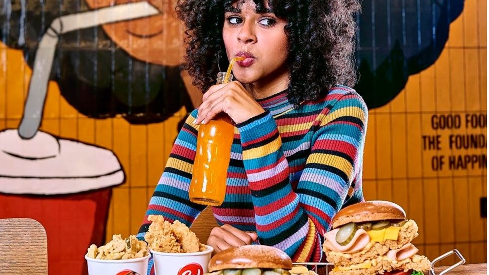 والجبنة مع شرائح الخيار المخلل والبصل، مع طلب قطع ناجتس الدجاج الـ Juicy مع الطبقة المقرمشة الخارجية، التي تعد