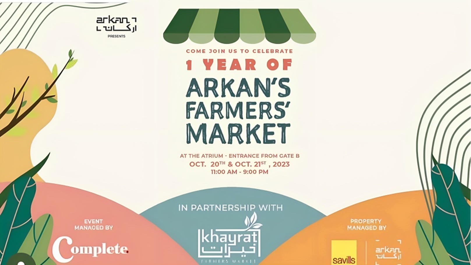 أعلن الصفحة الرسمية لأركان بلازا عن انطلاق معرض Arkan's farmers' Market بداية من الفترة الجمعة والسبت القادمين الموافق 20، 21 أكتوبر، على أن تفتح الأبواب لاستقبال الجمهور في تمام الساعة 11 صباحًا حتى الساعة 8 مساء.