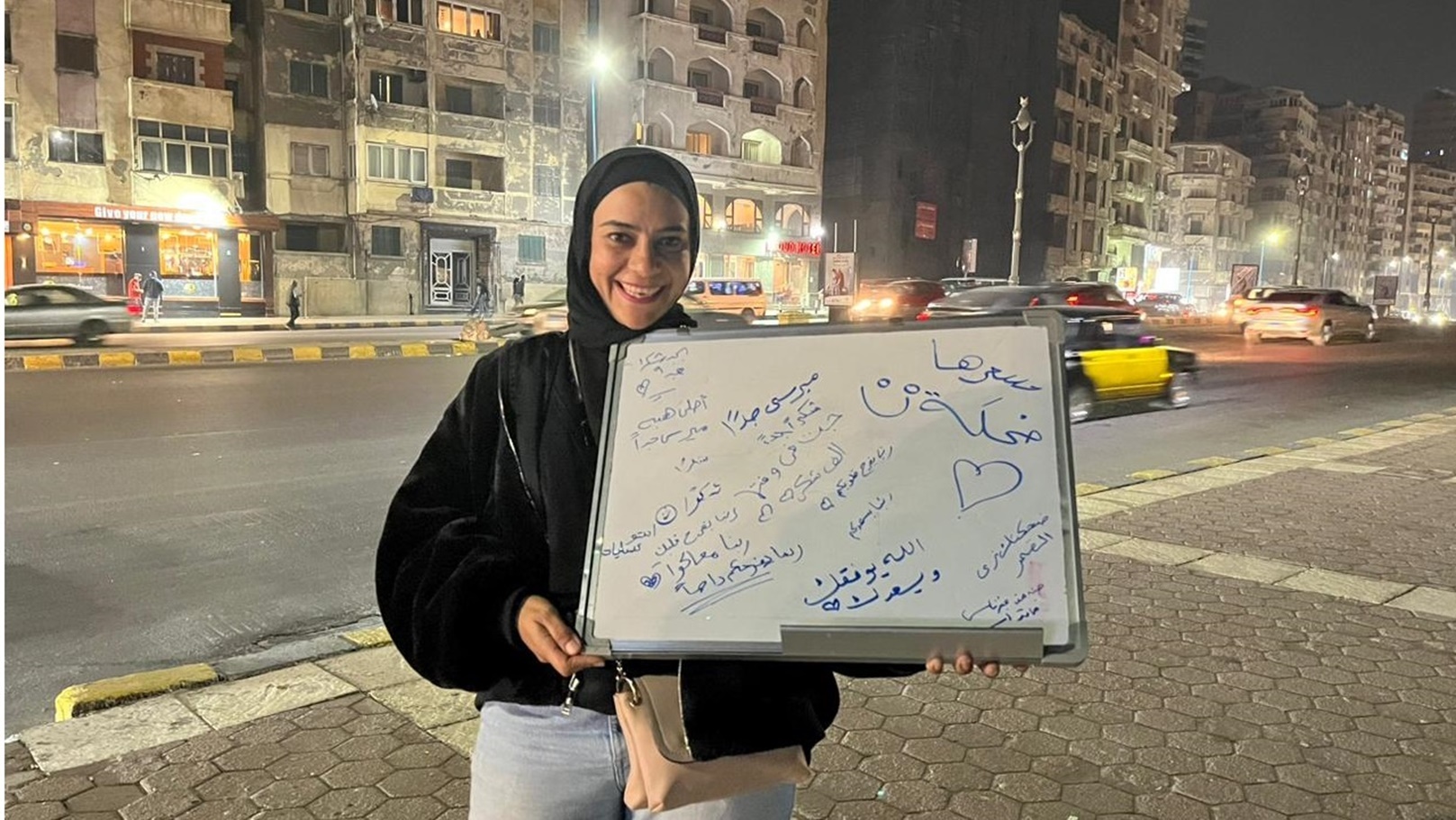 بابتسامة بشوشة تملىء وجهها، تتجول في شوارع الإسكندرية بلوحة مملوءه بالحلويات والشوكولاتة، حيث قررت الفتاة العشرينية رسم الابتسامة على وجوه المارة بلافتة مكتوب عليها "سعرها ضحكة".