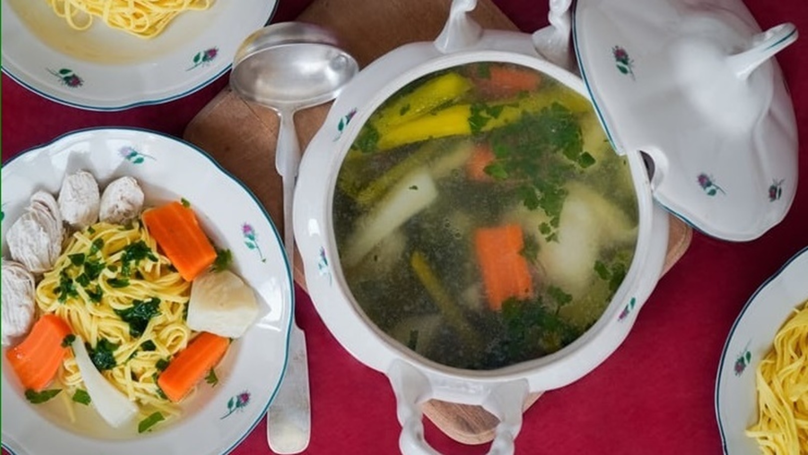 - تصنع شوربة الدجاج الألمانية من مرق الفراخ والخضروات والمكرونة.