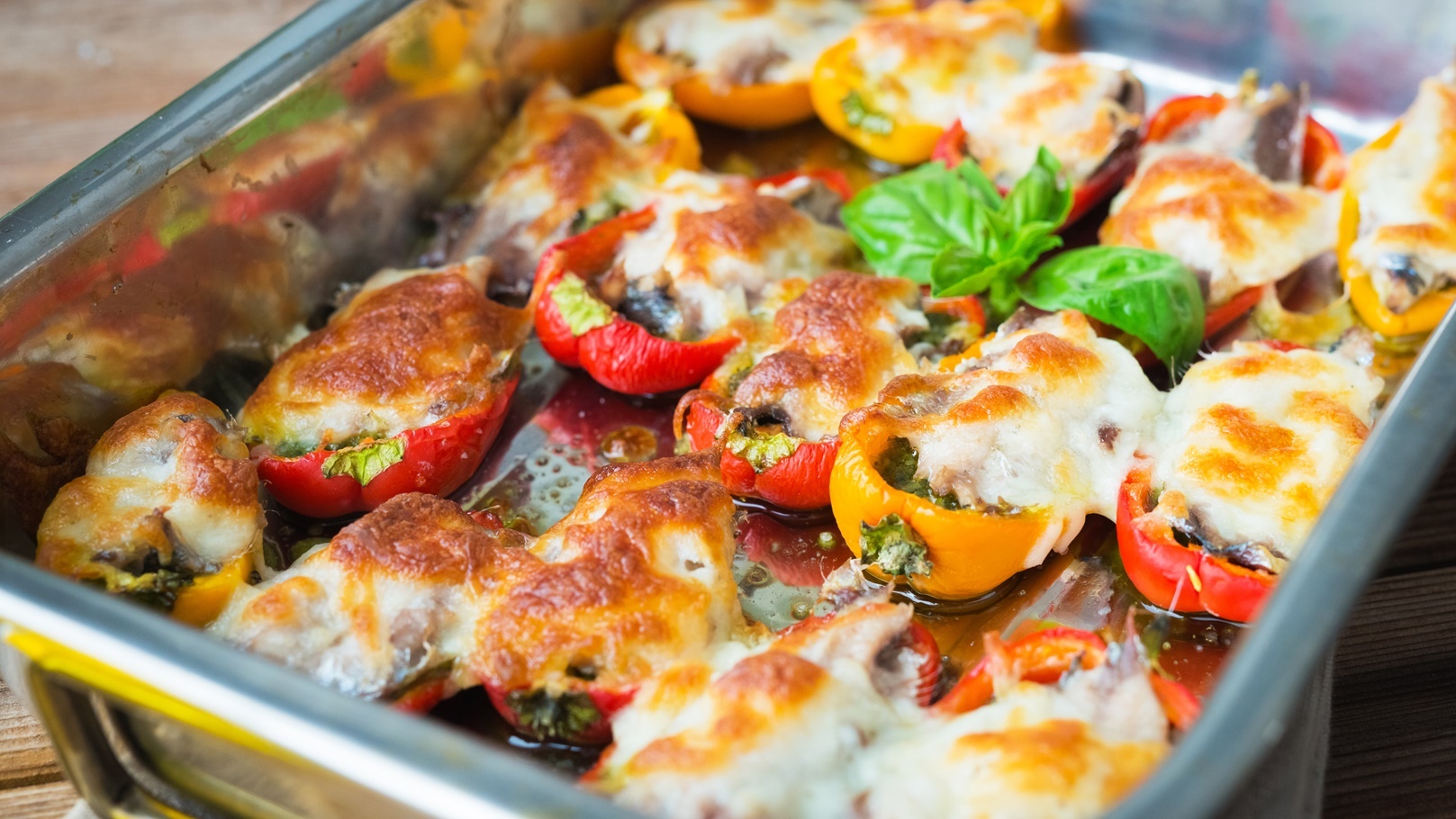 -ترش الجبن الموتزريلا على وجه حبات الفلفل الملون ، وتدخل الصينية الفرن لمدة 30 دقيقة.