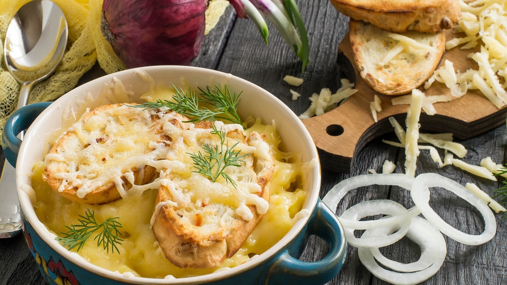 6- تقدم شوربة البصل ساخنة في طبق التقديم.