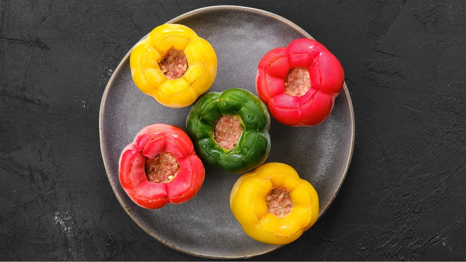 4- يُحشى الفلفل بخليط اللحم، ويرص في الصينية ومعه الفلفل الحار والطماطم.