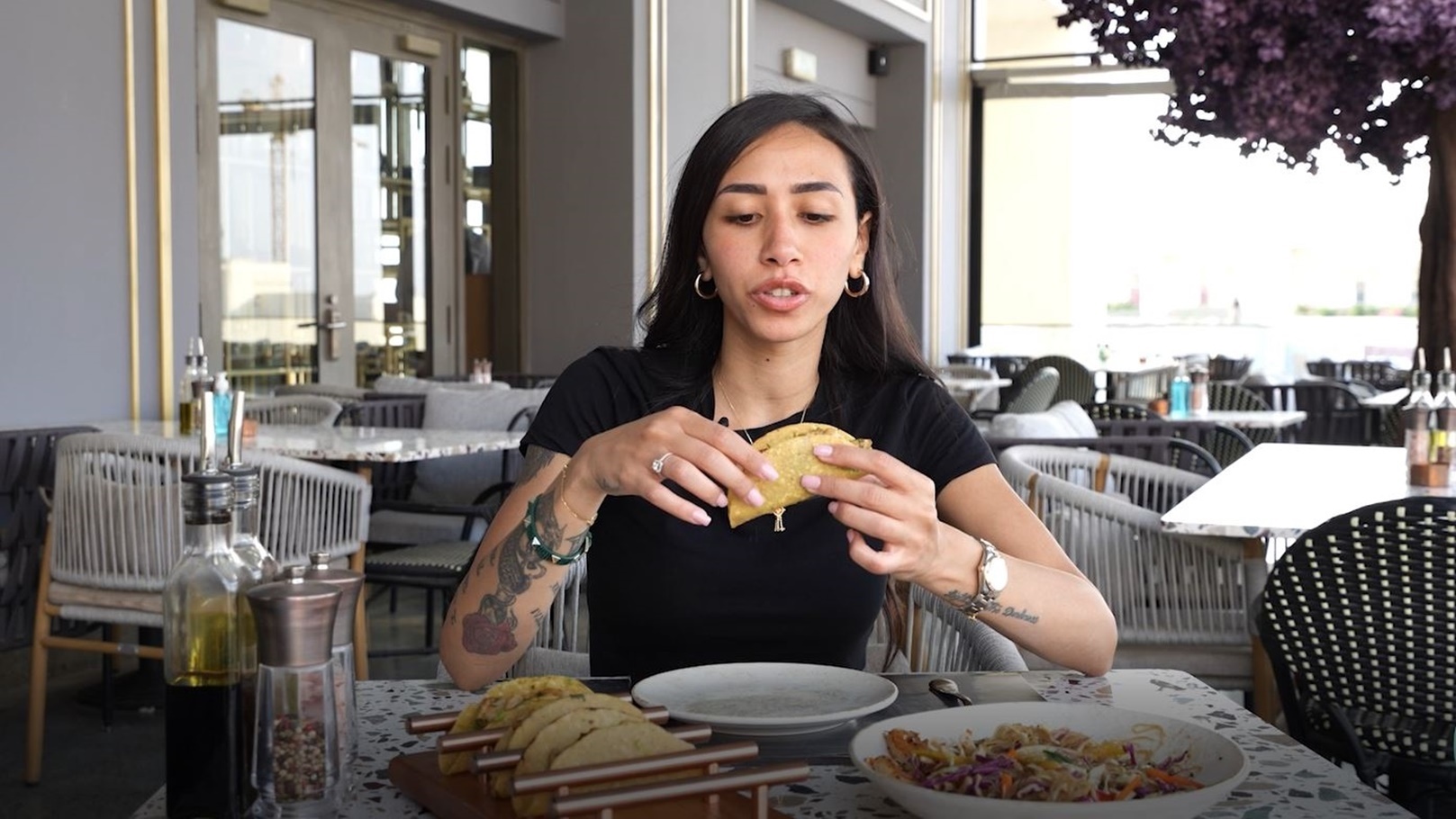 جربت "فيروز" الأبتيزر وكان تونة بالمانجة، وبيف، وقالت ان التونة أحلى، وكمان جربت تشيكن تاكوز، وتاي شرمب سالاد، وعجبها الروزيتو.