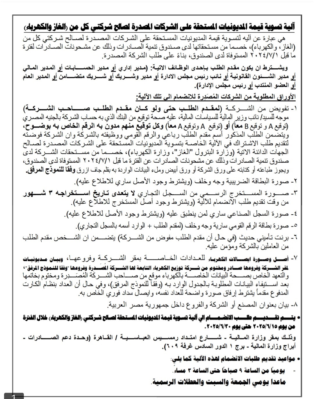 وتفتح وزارة المالية باب التقديم للاستفادة من هذه الآلية خلال الفترة من 15 إلى 30 يونيو 2025، بمقر وحدة دعم المصدرين – وزارة المالية – أبراج وزارة المالية – برج 1 – الدور السادس – غرفة 609 – شارع امتداد رمسيس، العباسية، القاهرة، يوميًا من الساعة 9 صباحًا إلى 3 عصرًا، باستثناء يومي الجمعة والسبت والعطلات الرسمية.