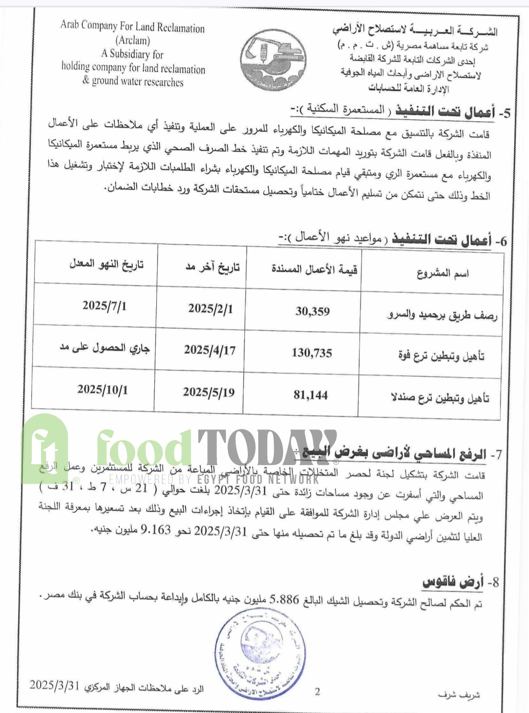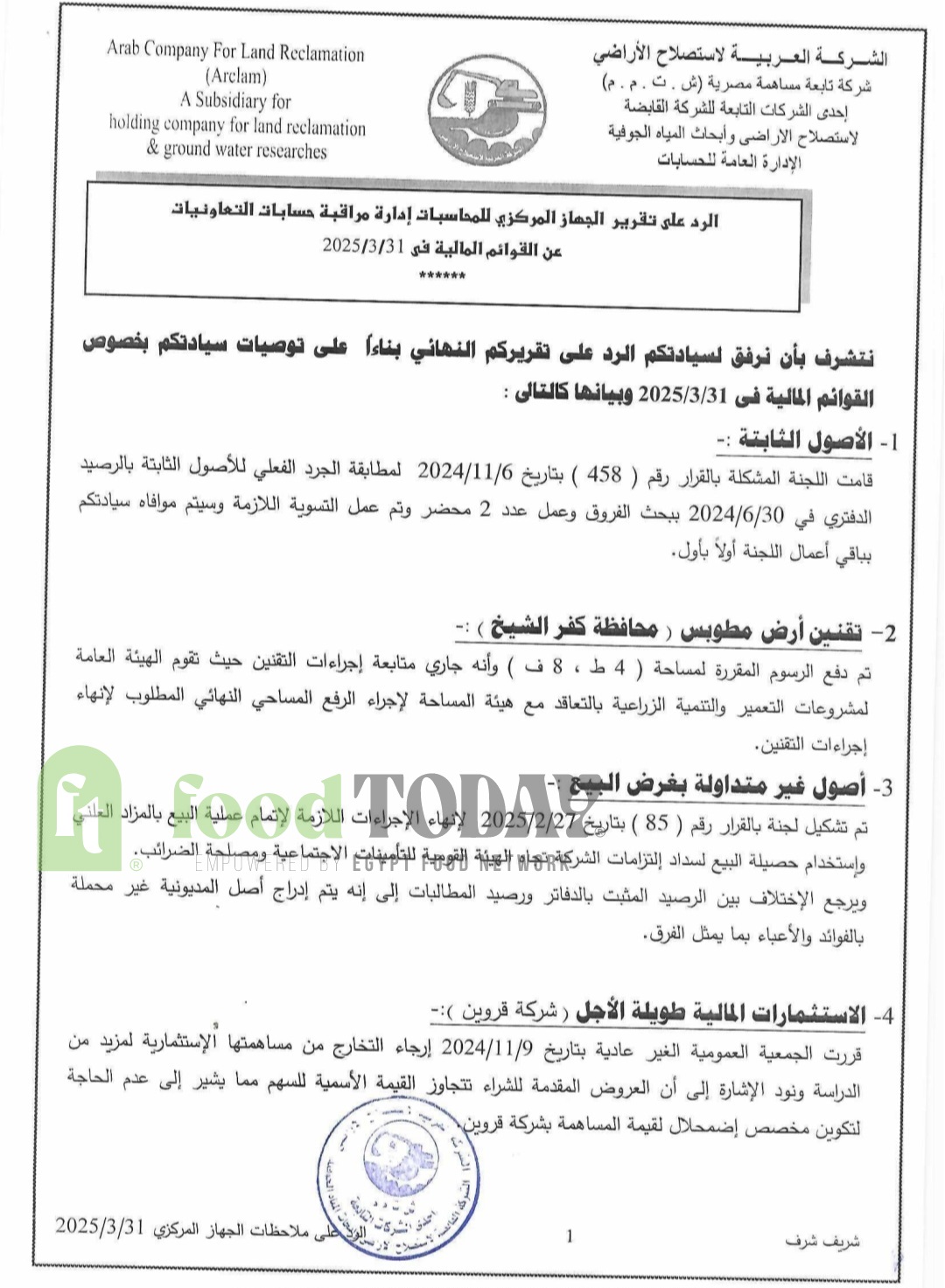 أعلنت الشركة العربية لاستصلاح الأراضي، التابعة للشركة القابضة لاستصلاح الأراضي وأبحاث المياه الجوفية، عن ردها الرسمي على تقرير الجهاز المركزي للمحاسبات بشأن القوائم المالية حتى 31 مارس 2025، موضحة أنها اتخذت عددًا من الإجراءات التصحيحية والتنظيمية استجابةً للتوصيات الواردة في التقرير.