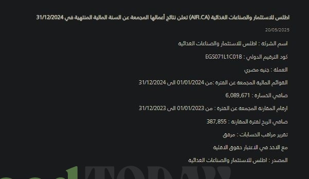 صافي خسارة قدره 6.09 مليون جنيه مصري، مقارنةً بصافي ربح بلغ 387.9 ألف جنيه خلال