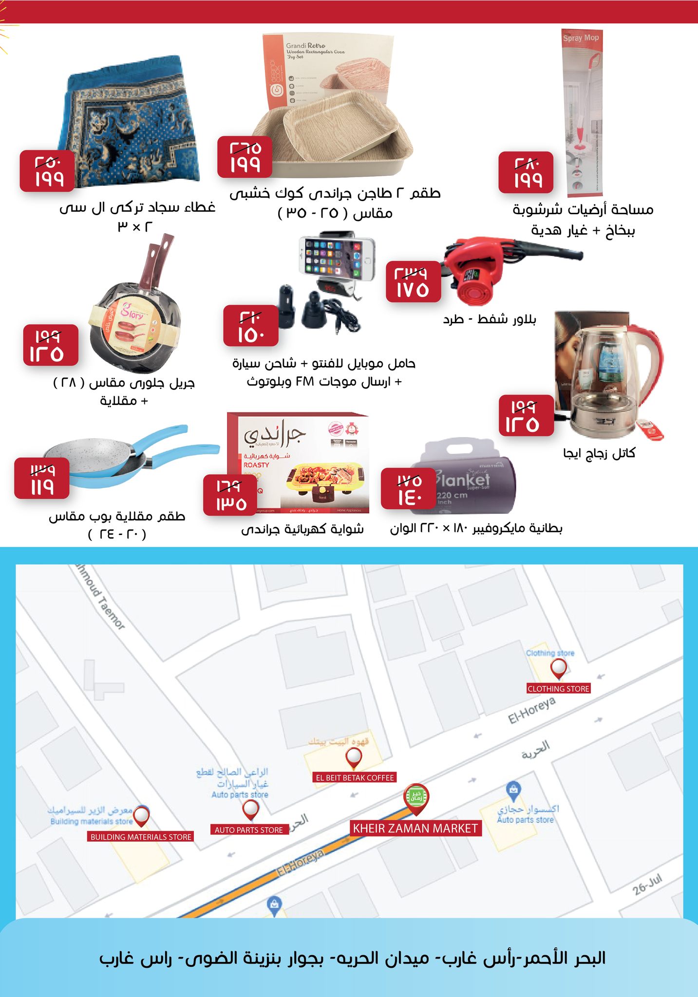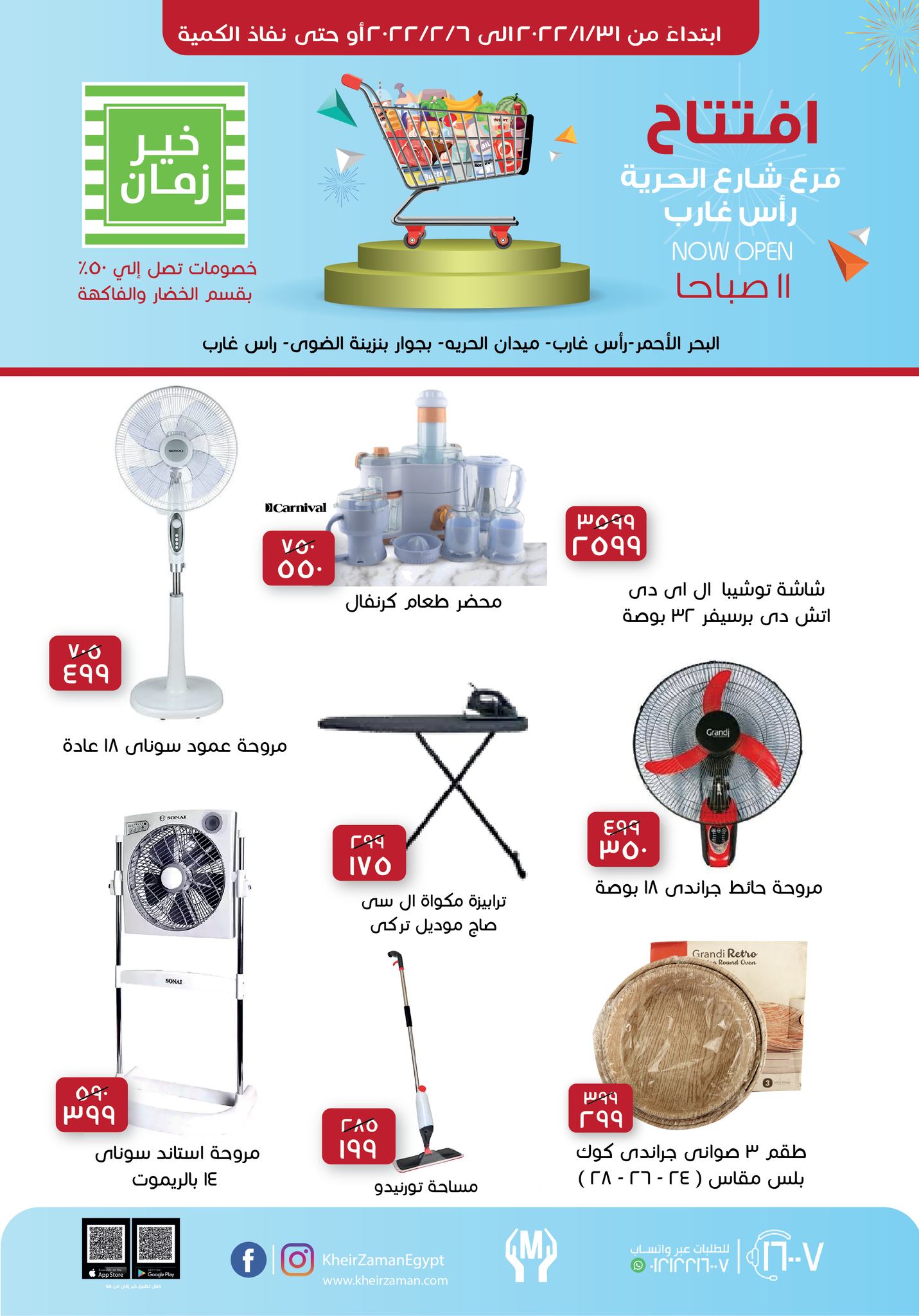 طرحت سلسلة «خير زمان» تخفيضات على عدد من السلع الغذائية والأدوات المنزلية، بمناسبة افتتاح فرعها الجديد بمحافظة البحر الأحمر، وتحديدا في شارع الحرية برأس غارب.