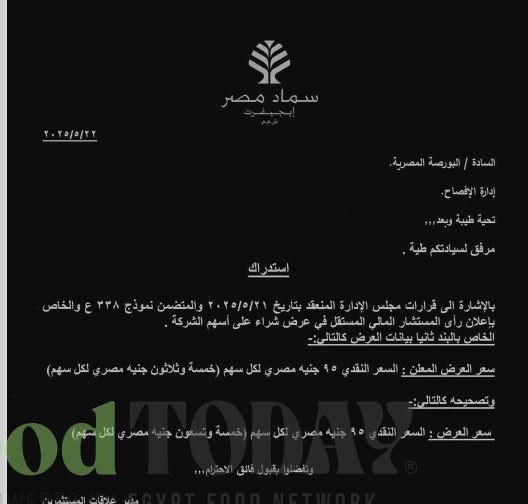 وبحسب الوثيقة، فقد تم الإعلان في النموذج أن سعر عرض الشراء هو ٩٥ جنيهًا مصريًا لكل سهم، إلا أن الرقم كُتب بالحروف على نحو خاطئ: "خمسة وثلاثون جنيهًا"، وهو ما أدى إلى لبس واضح، وفي هذا السياق، سارعت الشركة إلى إرسال استدراك رسمي لتأكيد أن السعر الصحيح هو ٩٥ جنيهًا (خمسة وتسعون جنيهًا مصريًا لكل سهم)، كما ورد بالأرقام في النسخة الأصلية.