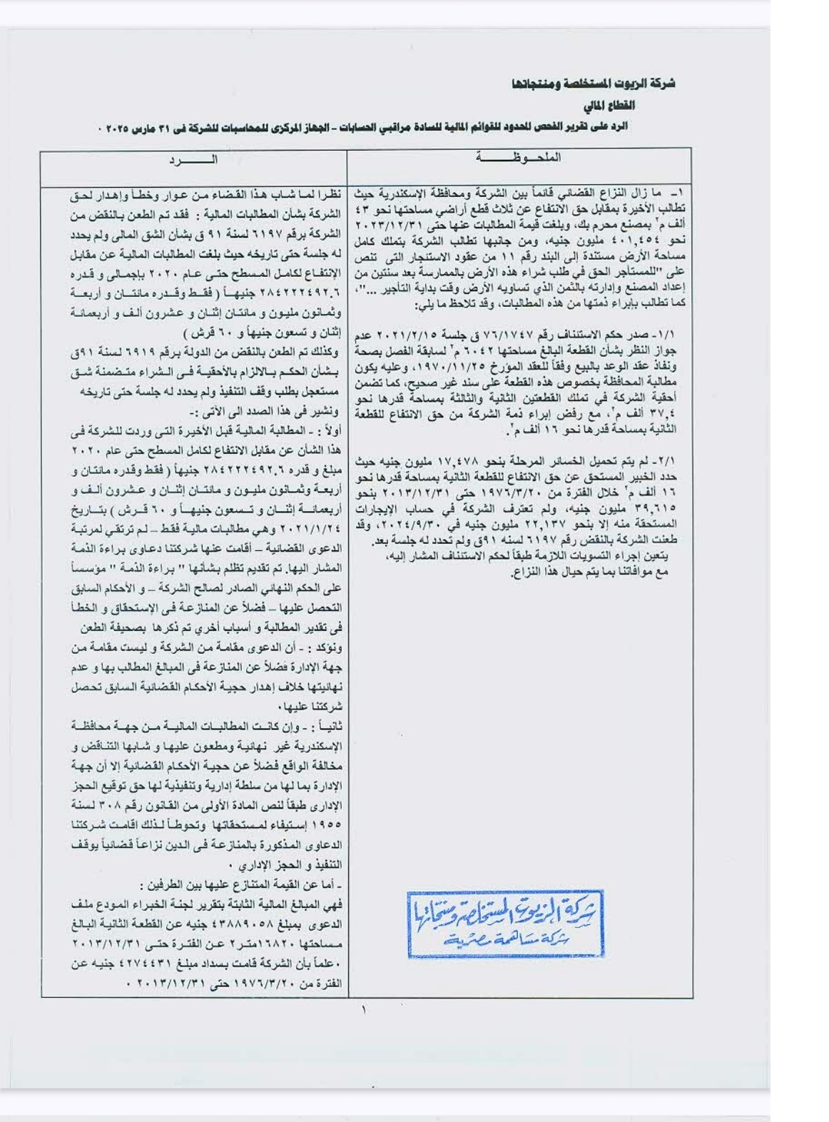 في إطار التقرير الصادر عن الجهاز المركزي للمحاسبات حول القوائم المالية لشركة الزيوت المستخلصة ومنتجاتها حتى 31 مارس 2025، وردت ملاحظة جوهرية تتعلق باستمرار النزاع القضائي بين الشركة ومحافظة الإسكندرية بشأن أراضي مصنع محرم بك، والبالغ إجمالي مساحتها نحو 43 ألف متر مربع.