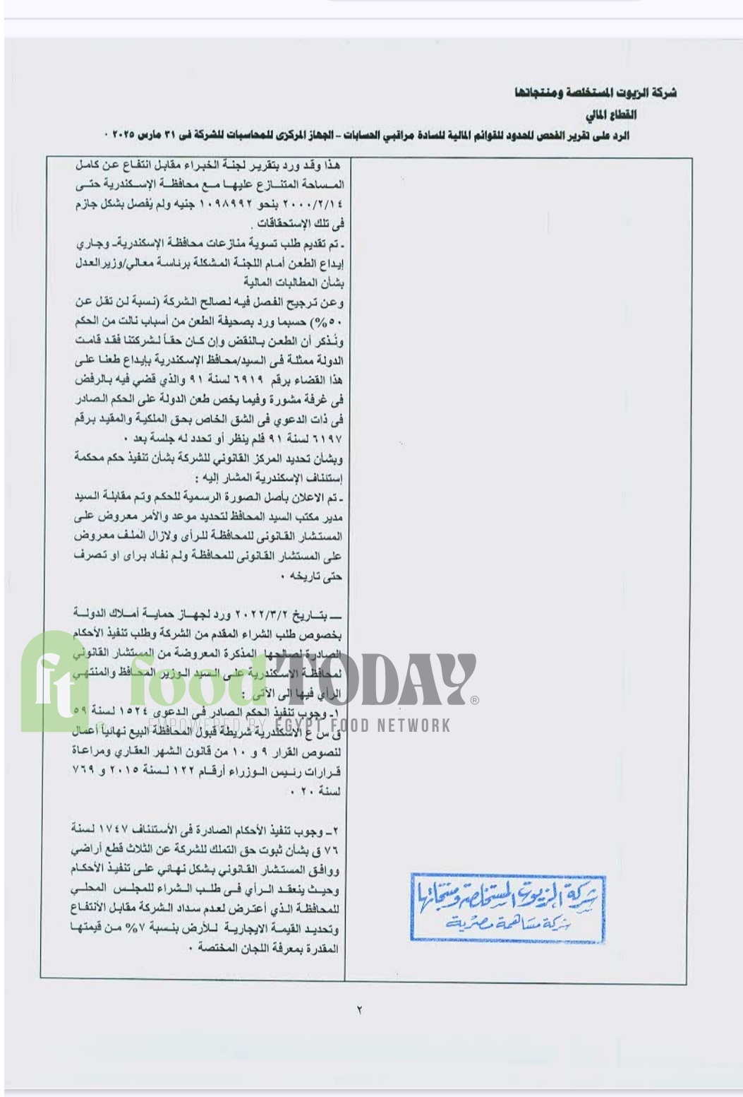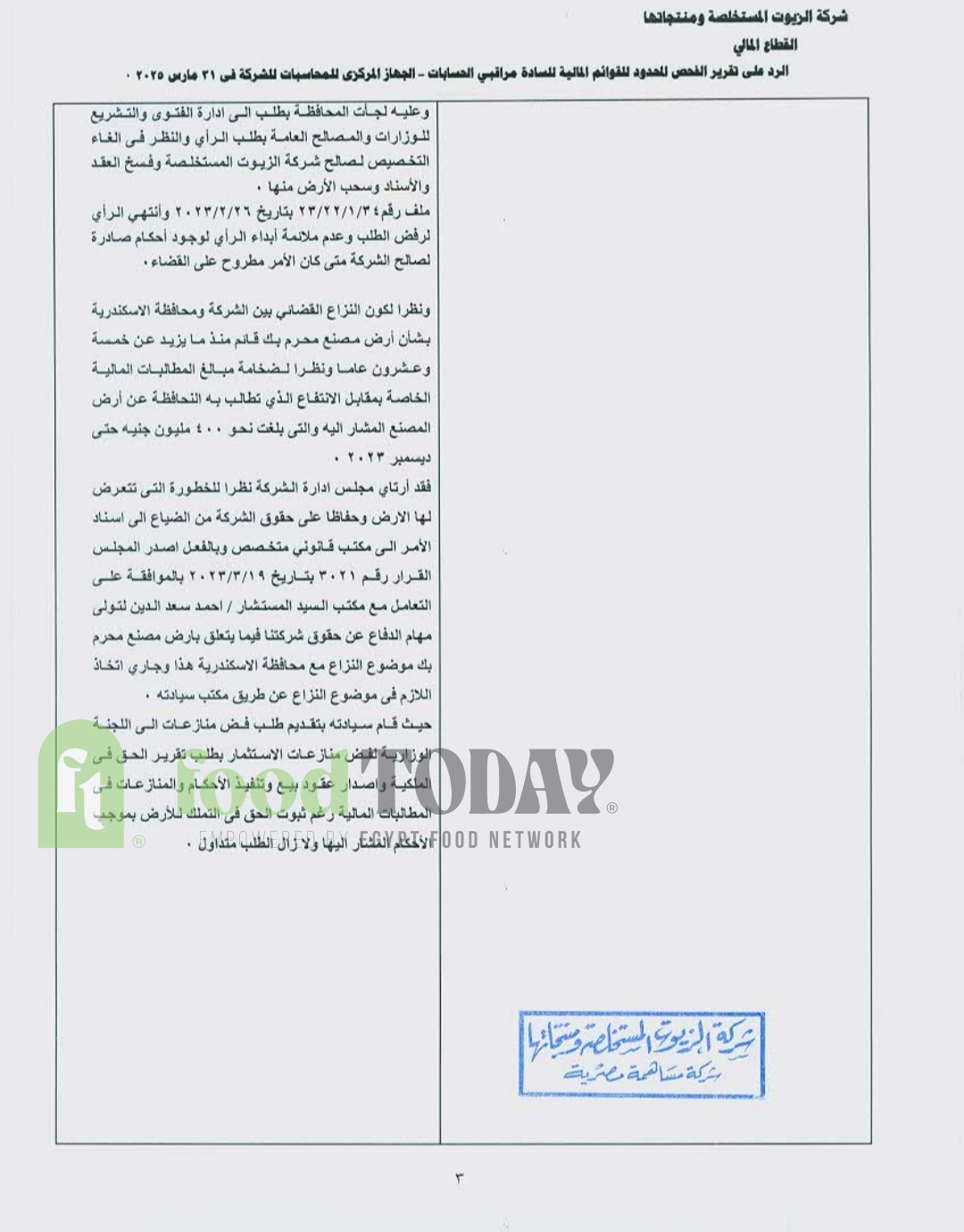 وتؤكد شركة الزيوت المستخلصة ومنتجاتها أنها مستمرة في اتخاذ كافة الإجراءات القانونية للدفاع عن حقوقها، وأنها لن تتنازل عن ملكيتها القانونية لأرض مصنع محرم بك، استنادًا إلى الأحكام القضائية الصادرة لصالحها، مشددة على التزامها الكامل بمعايير الشفافية والمحاسبة أمام الجهات الرقابية.